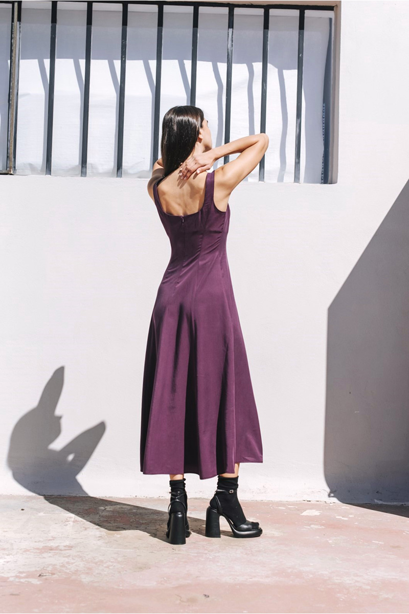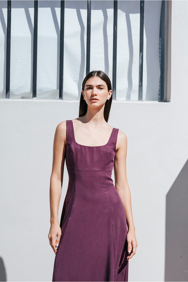 Μακρύ αμάνικο φόρεμα με φαρδιές τιράντες, τετράγωνη λαιμόκοψη. Kλείσιμο πίσω με φερμουάρ.