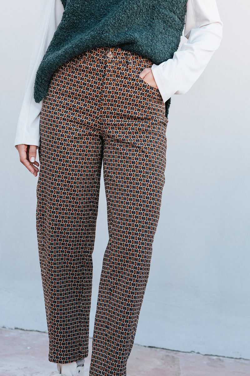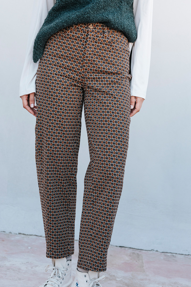 Εμπριμέ πεντάτσεπο παντελόνι βαμβακερό. Kλείσιμο μπροστά με φερμουάρ και κουμπί.