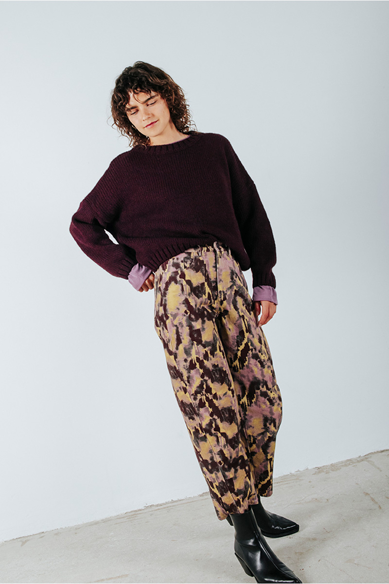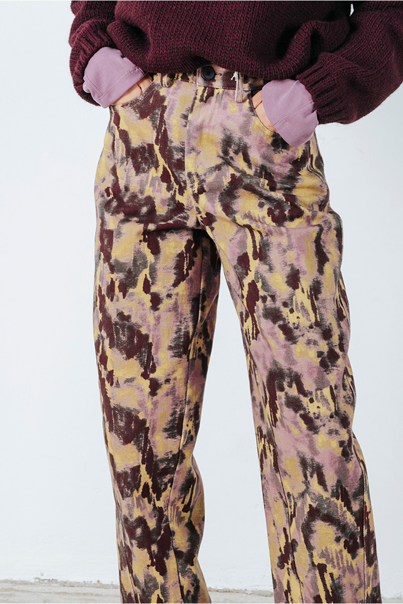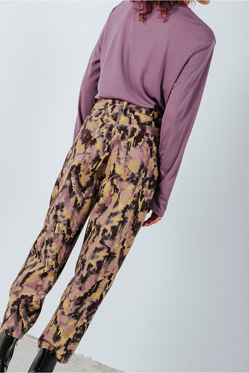 Εμπριμέ πεντάτσεπο παντελόνι βαμβακερό. Kλείσιμο μπροστά με φερμουάρ και κουμπί.