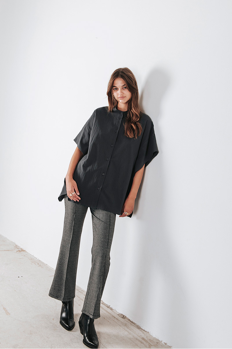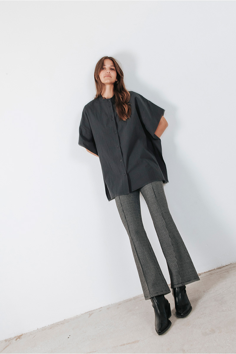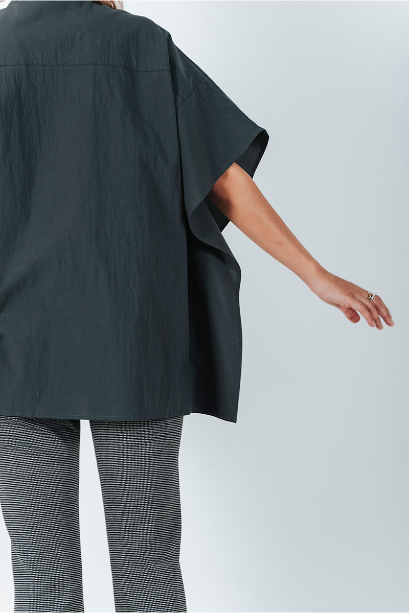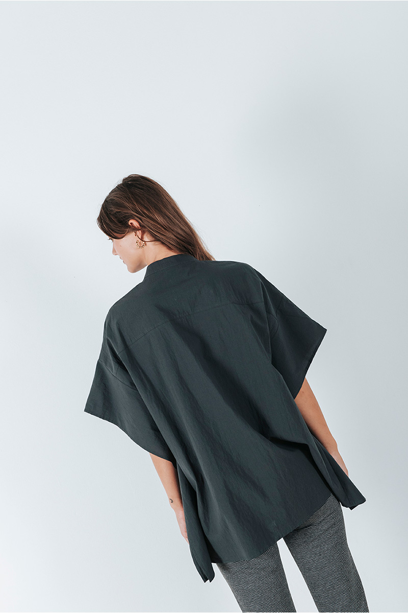 Βαμβακερό πουκάμισο φαρδύ με μάο λαιμόκοψη, κλείσιμο μπροστά με κουμπιά και λεπτομέρειες στο πλάι.