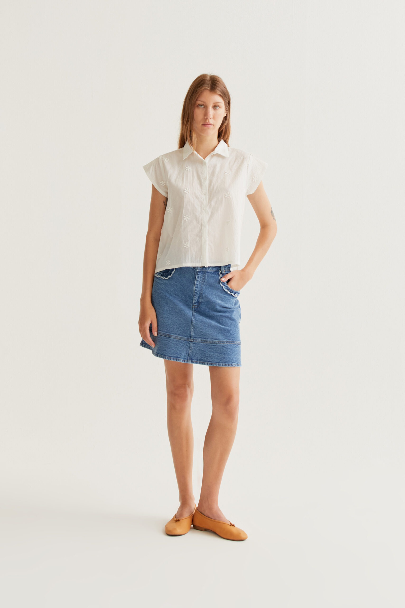 Κλείσιμο με κουμπιά μπροστά και πράσινα κουμπιά. Λεπτομέρεια με κεντημένο λουλούδι.