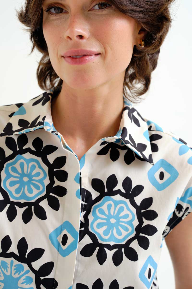 Διαθέτει γιακά με πέτο, κοντά μανίκια και κλείσιμο με κρυφά κουμπιά μπροστά.