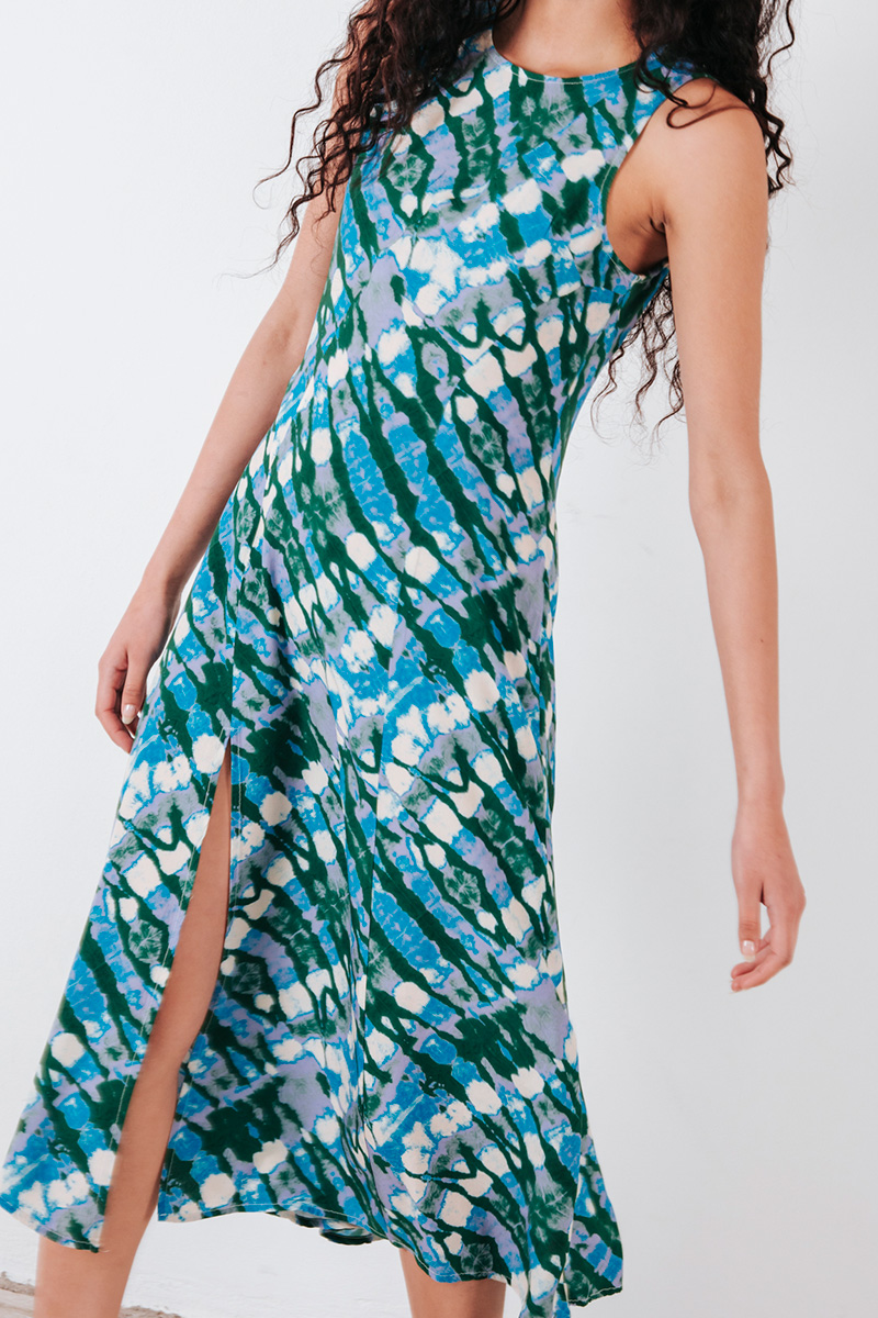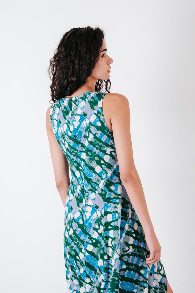 Αμάνικο εμπριμέ φόρεμα, με στρογγυλή λαιμόκοψη και κλείσιμο πίσω με κρυφό φερμουάρ.