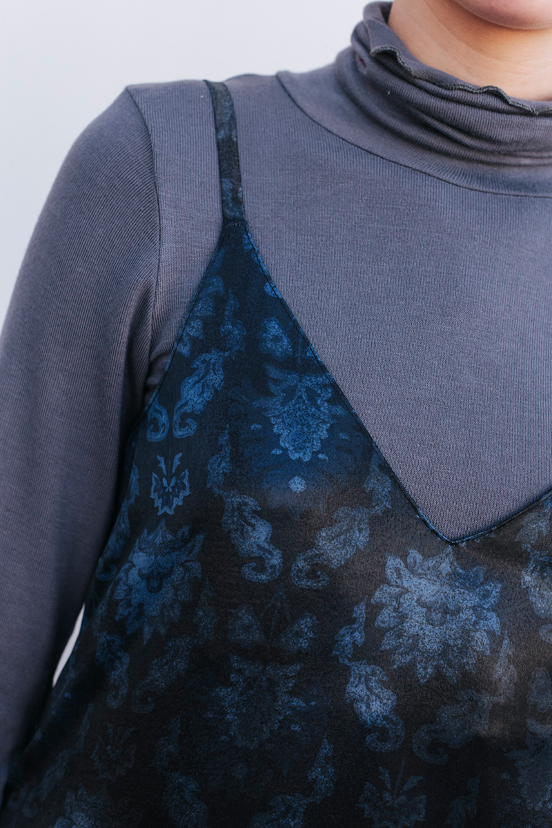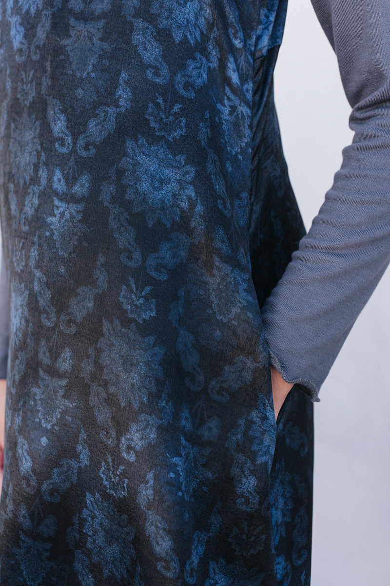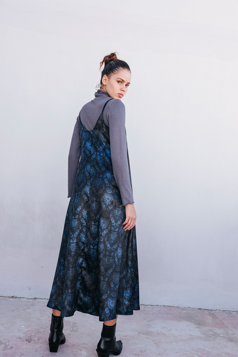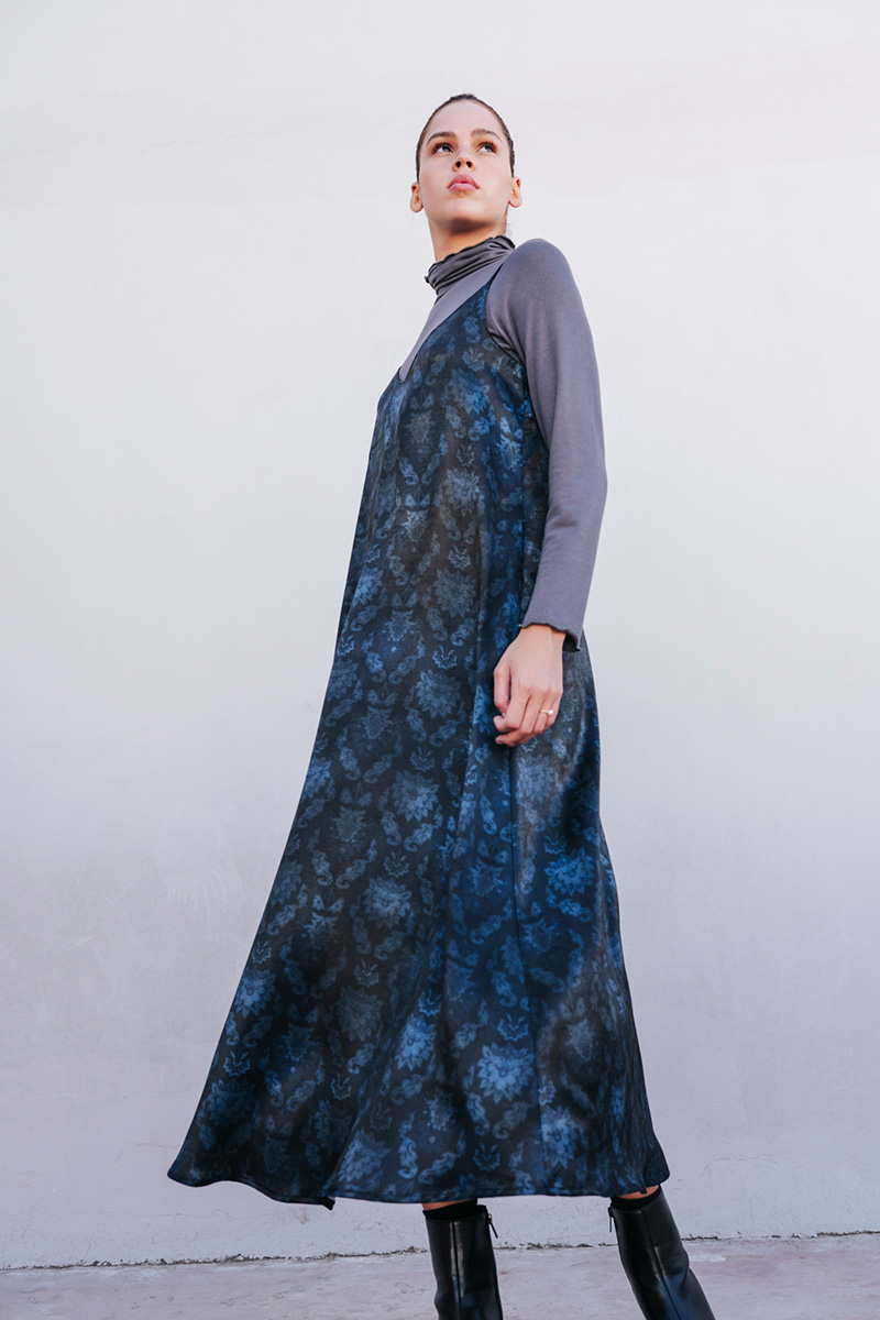 Εμπριμέ φόρεμα σατέν με V λαιμόκοψη, λεπτές τιράντες και τσέπες στο πλάι.