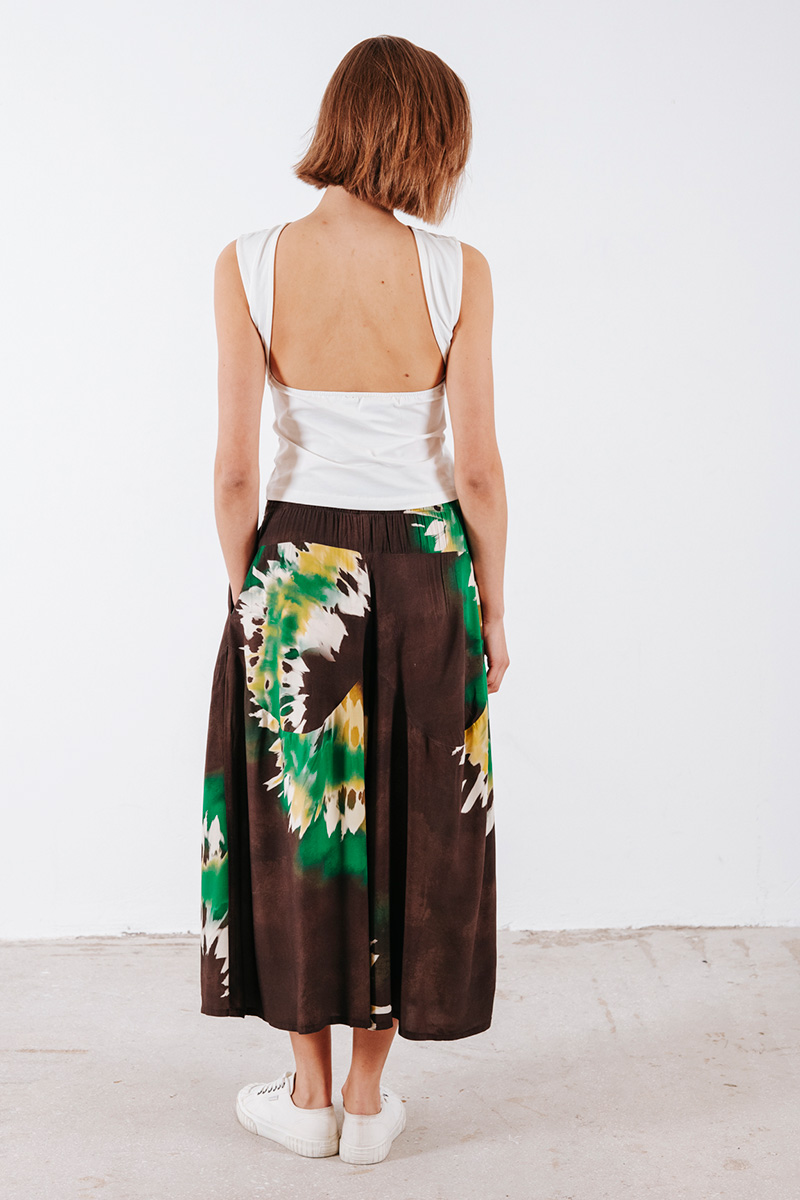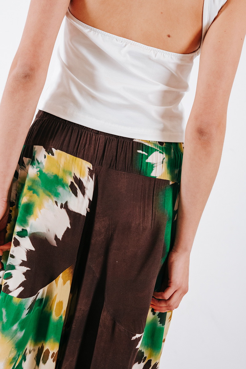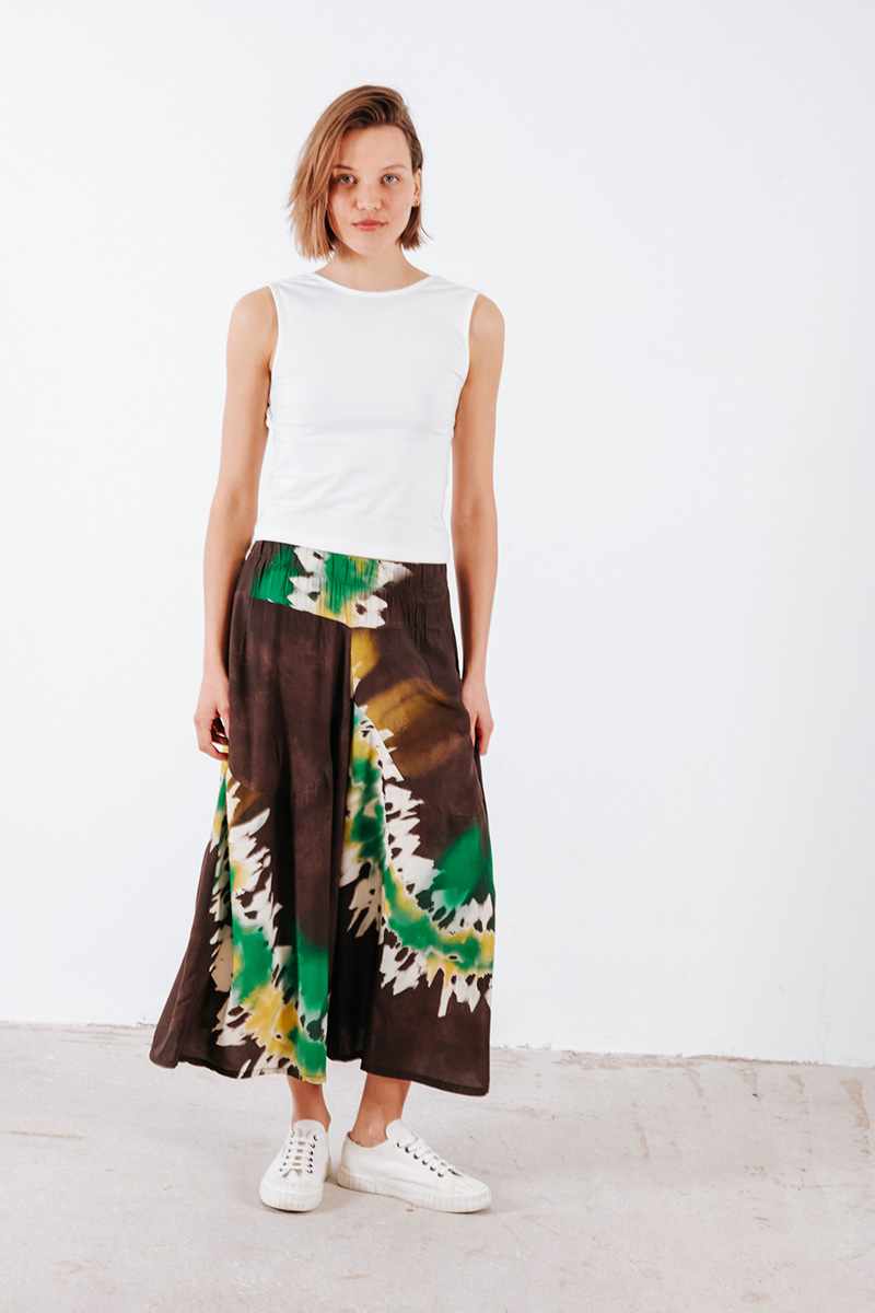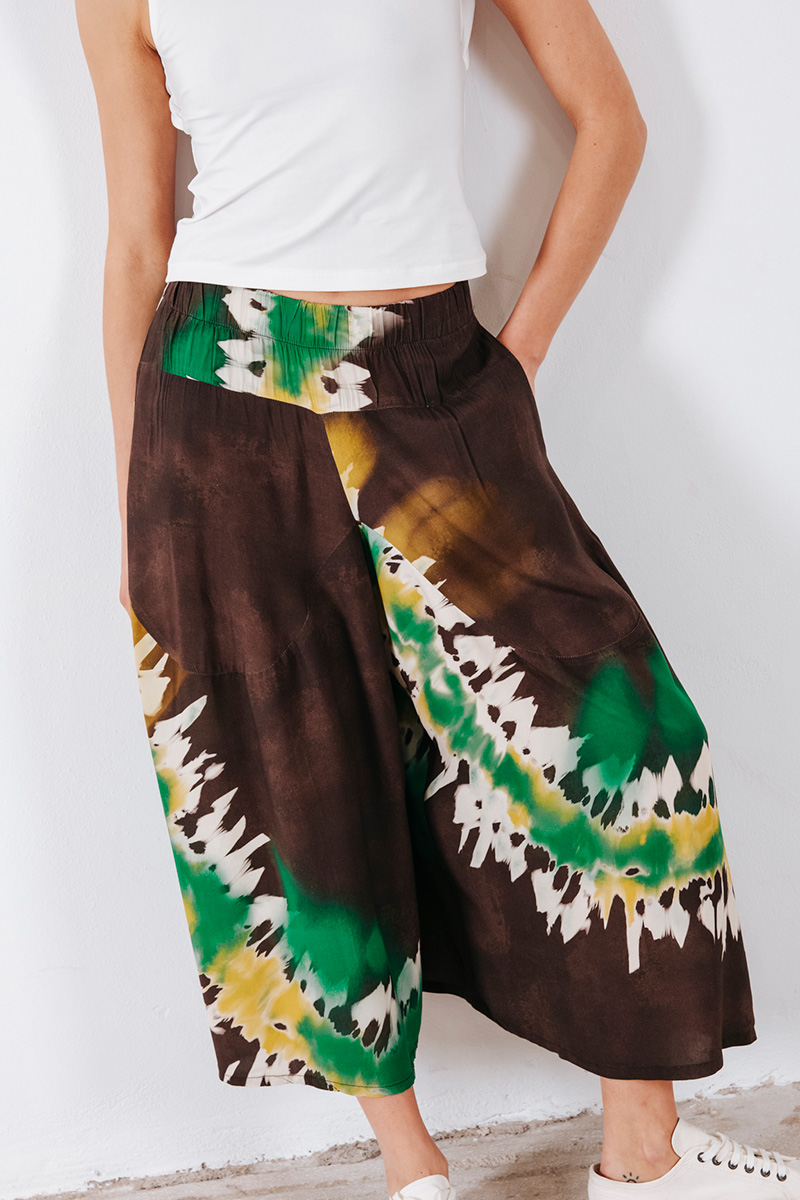 Εμπριμέ φαρδιά crop παντελόνα με λάστιχο στη μέση και τσέπες στο πλάι.