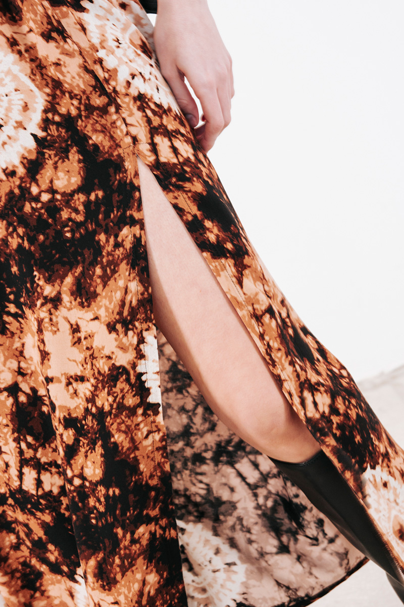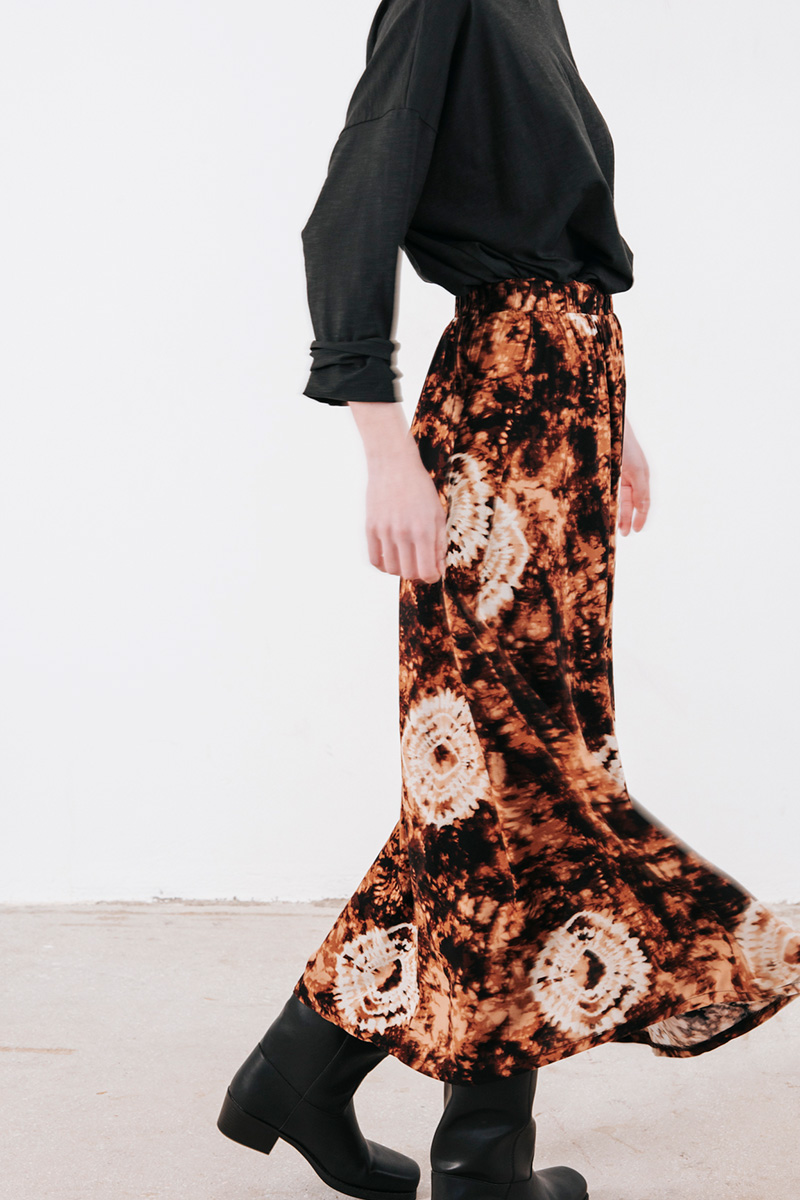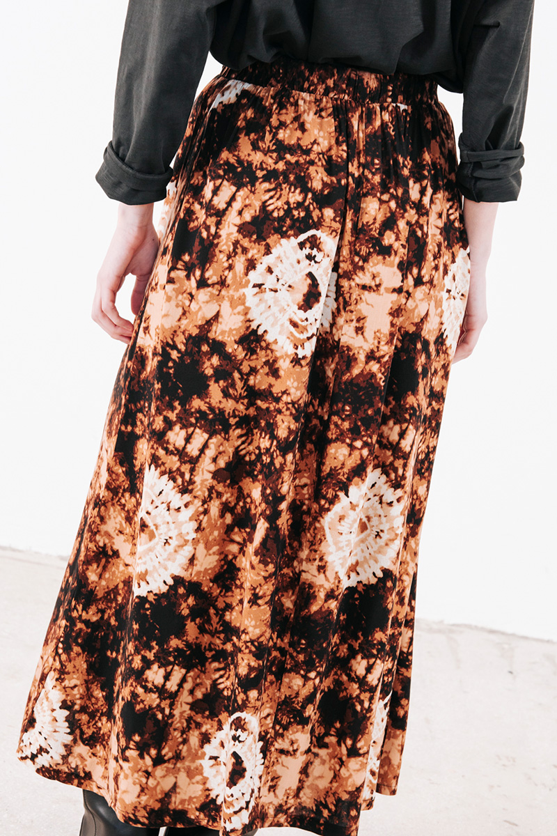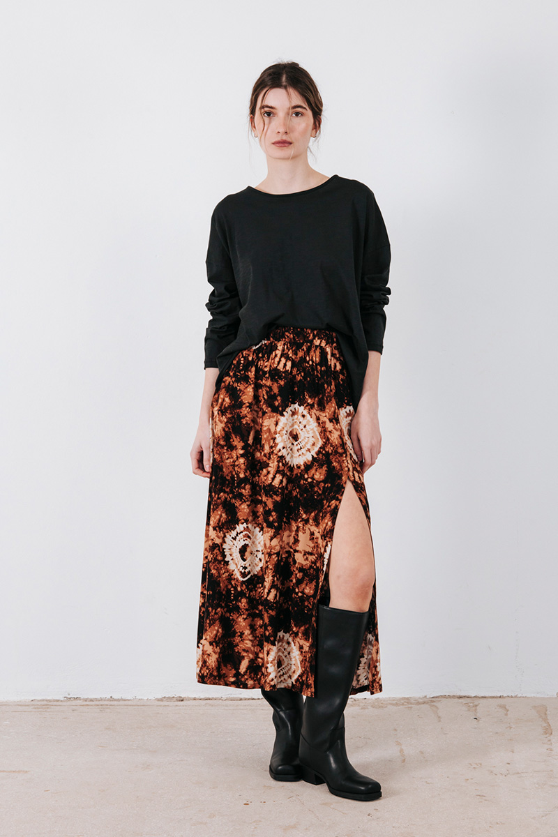 Εμπριμέ φούστα με λάστιχο στη μέση και άνοιγμα μπροστά.