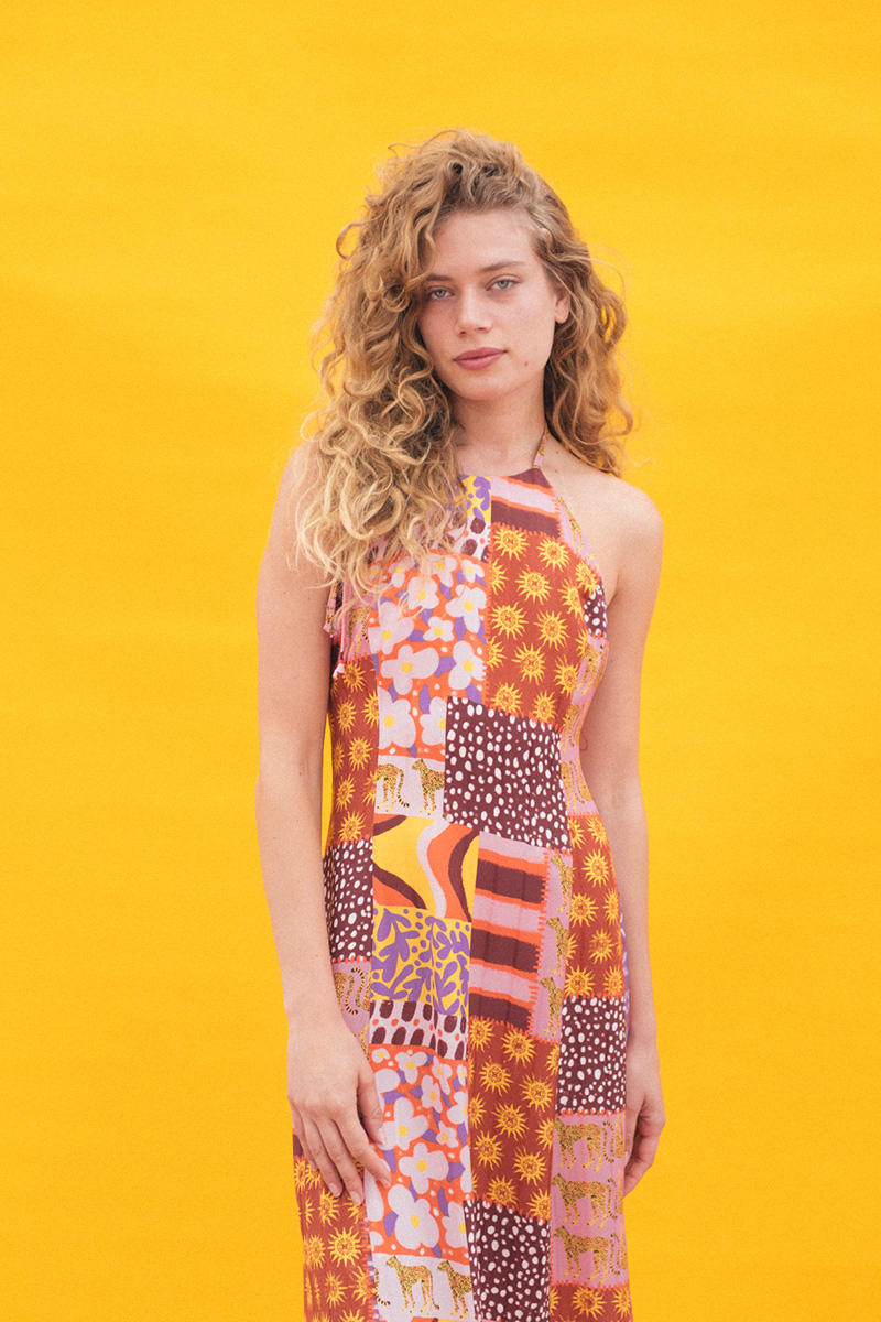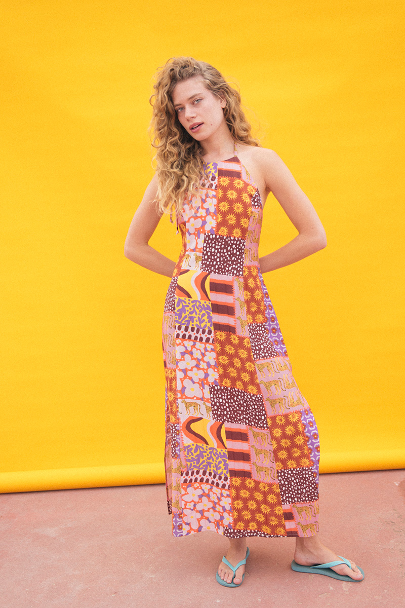 Εμπριμέ φόρεμα με ανοιχτή πλάτη, δέσιμο στον λαιμό και ανοίγματα στο πλάι.