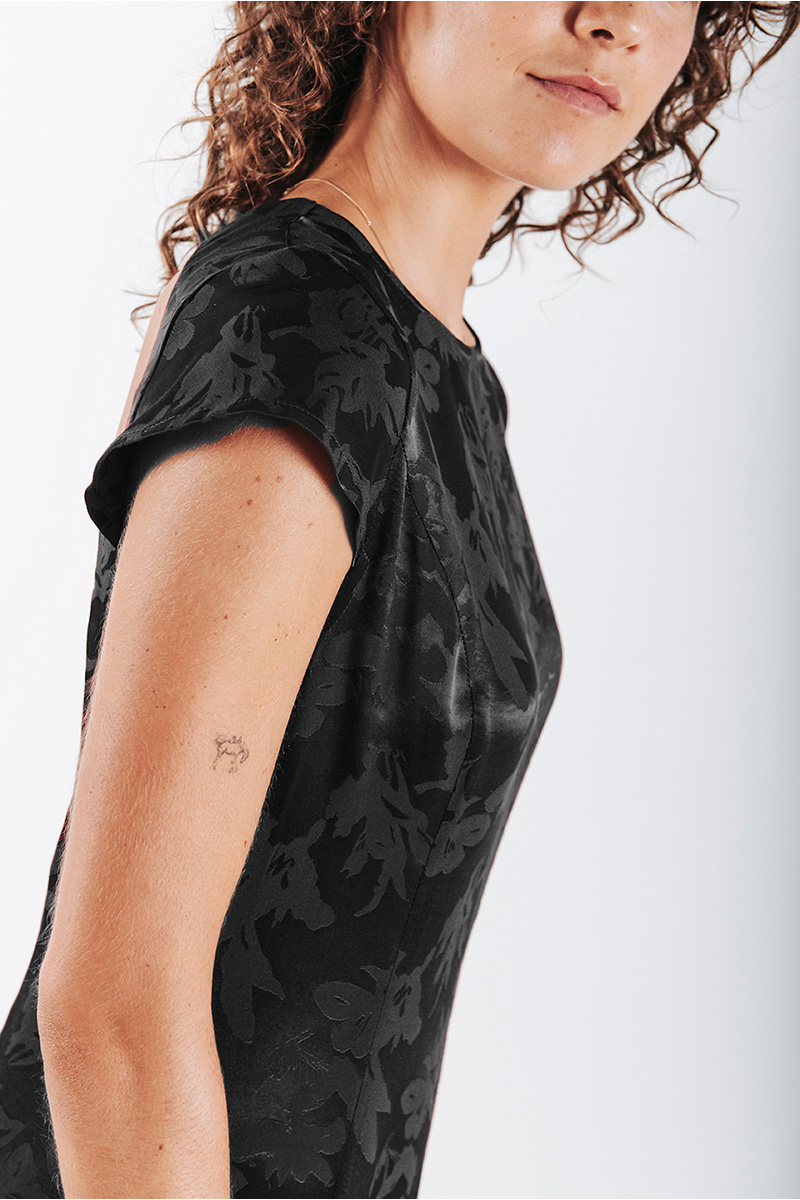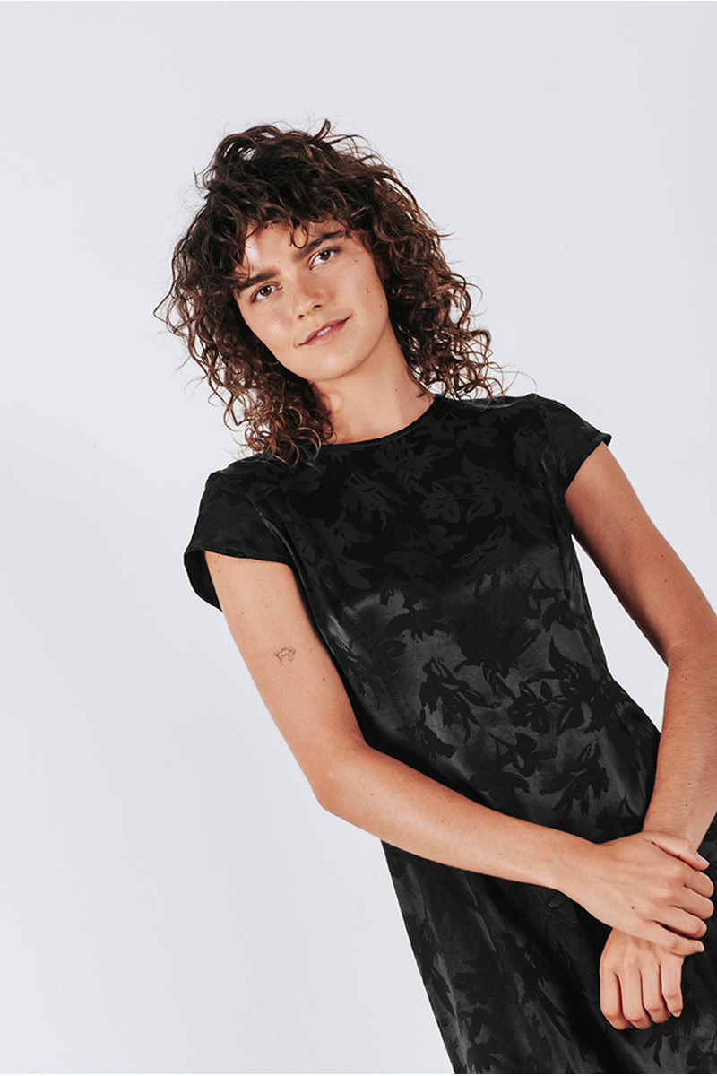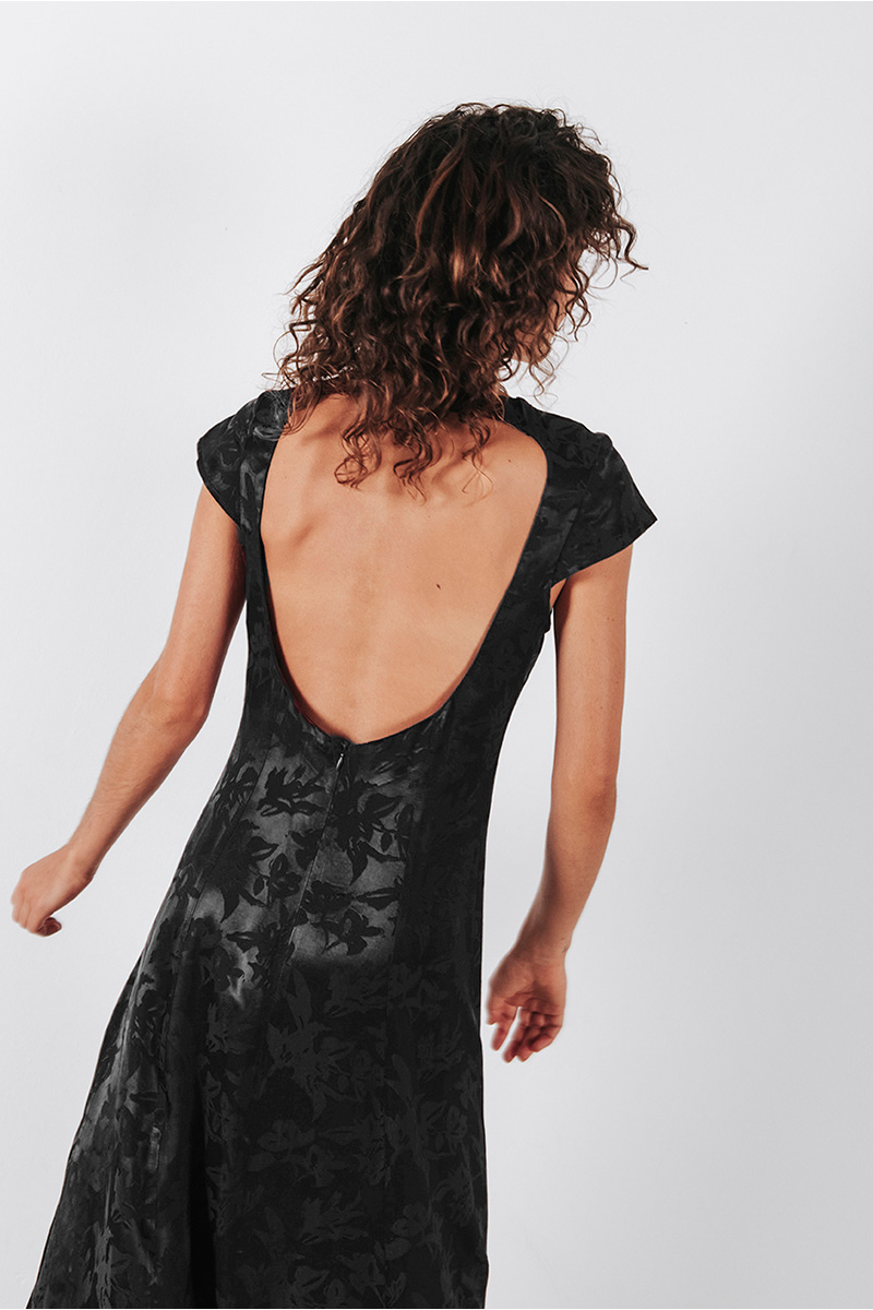 Φόρεμα ζακάρ σατέν με ανοιχτή πλάτη, κούμπωμα πίσω με κουμπιά και φερμουάρ.