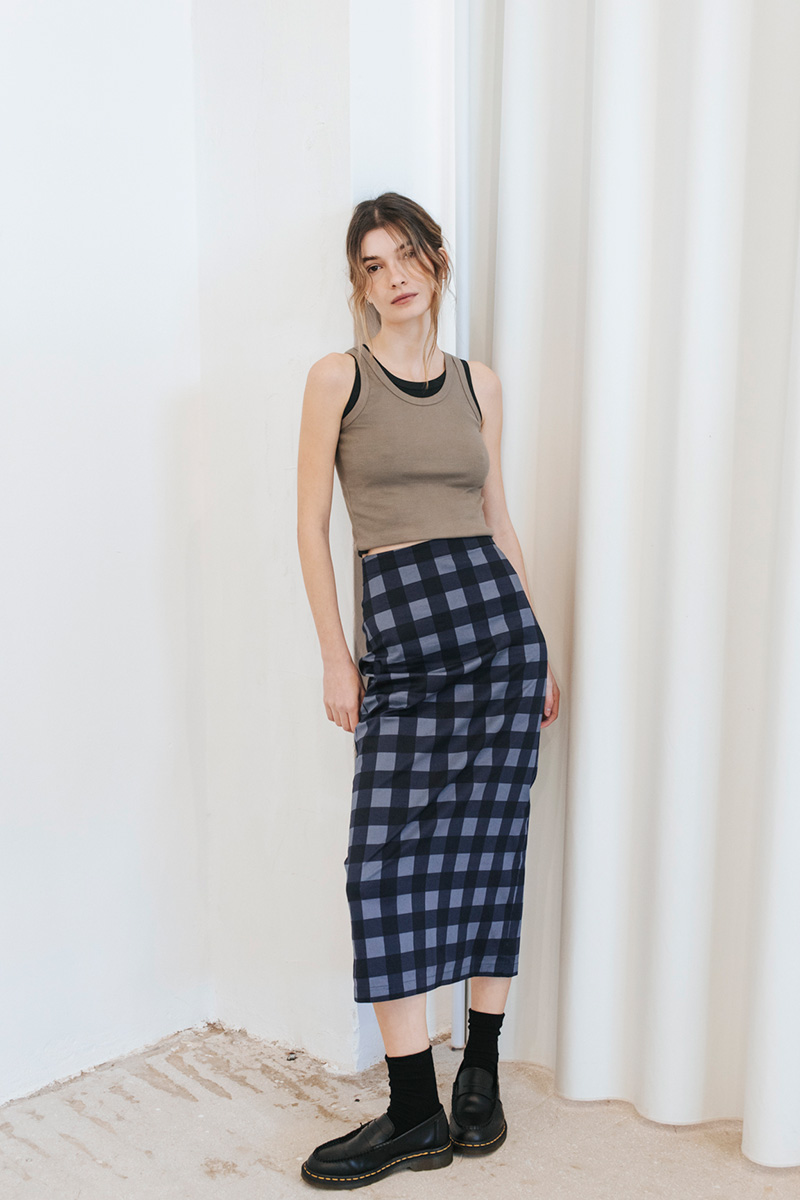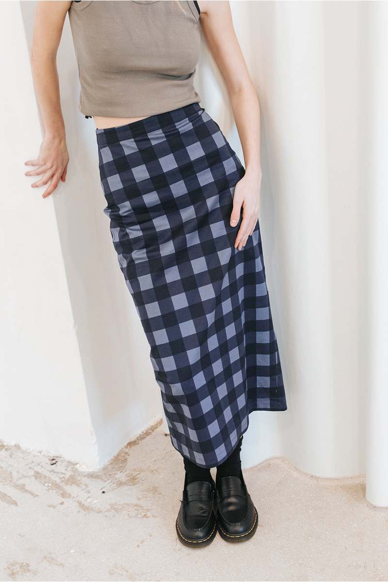 Καρό μίντι φούστα με άνοιγμα πίσω και κλείσιμο πίσω με κρυφό φερμουάρ.