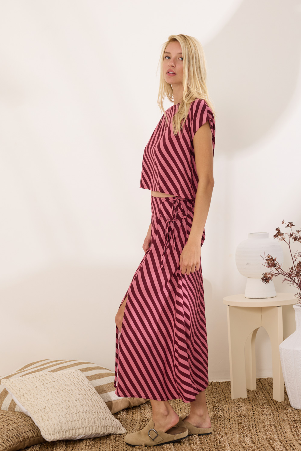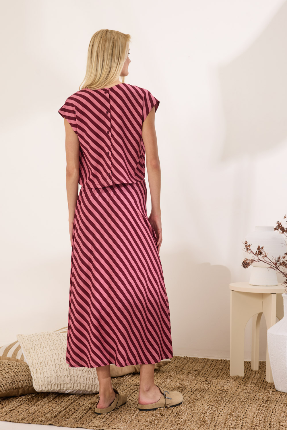 Διακοσμείται με έντονο print με ρίγες σε χρωματικό συνδυασμό σε αντίθεση,
