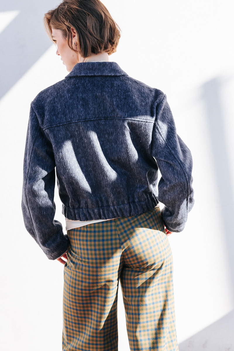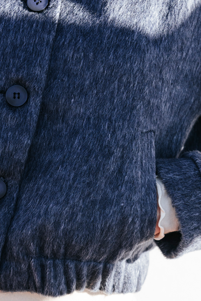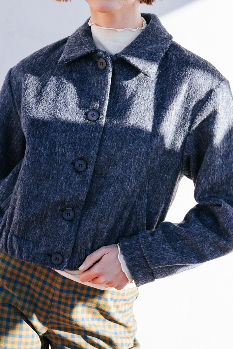 Κοντό τζάκετ με γιακά, λάστιχο στο κάτω μέρος και κλείσιμο μπροστά με κουμπιά.
