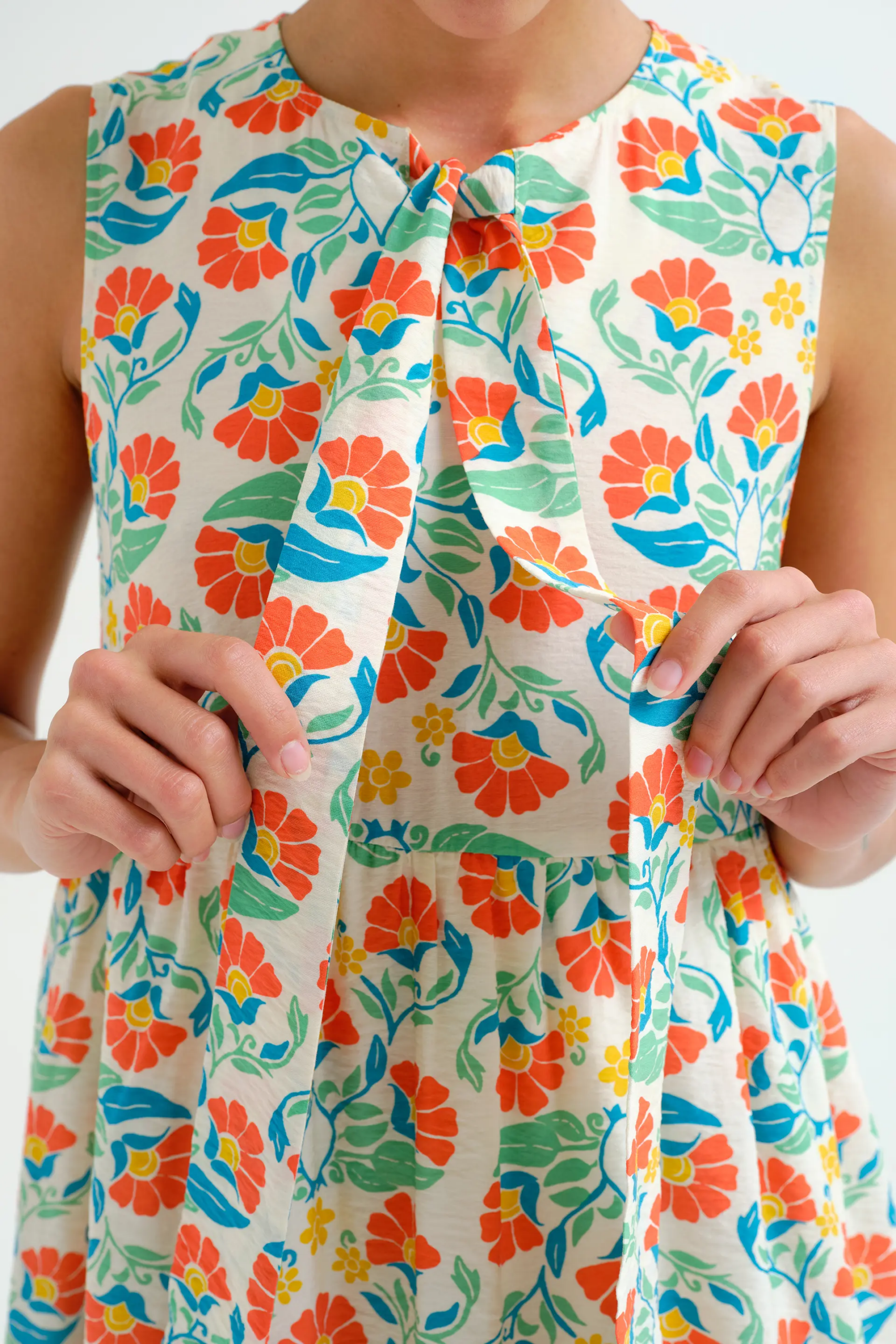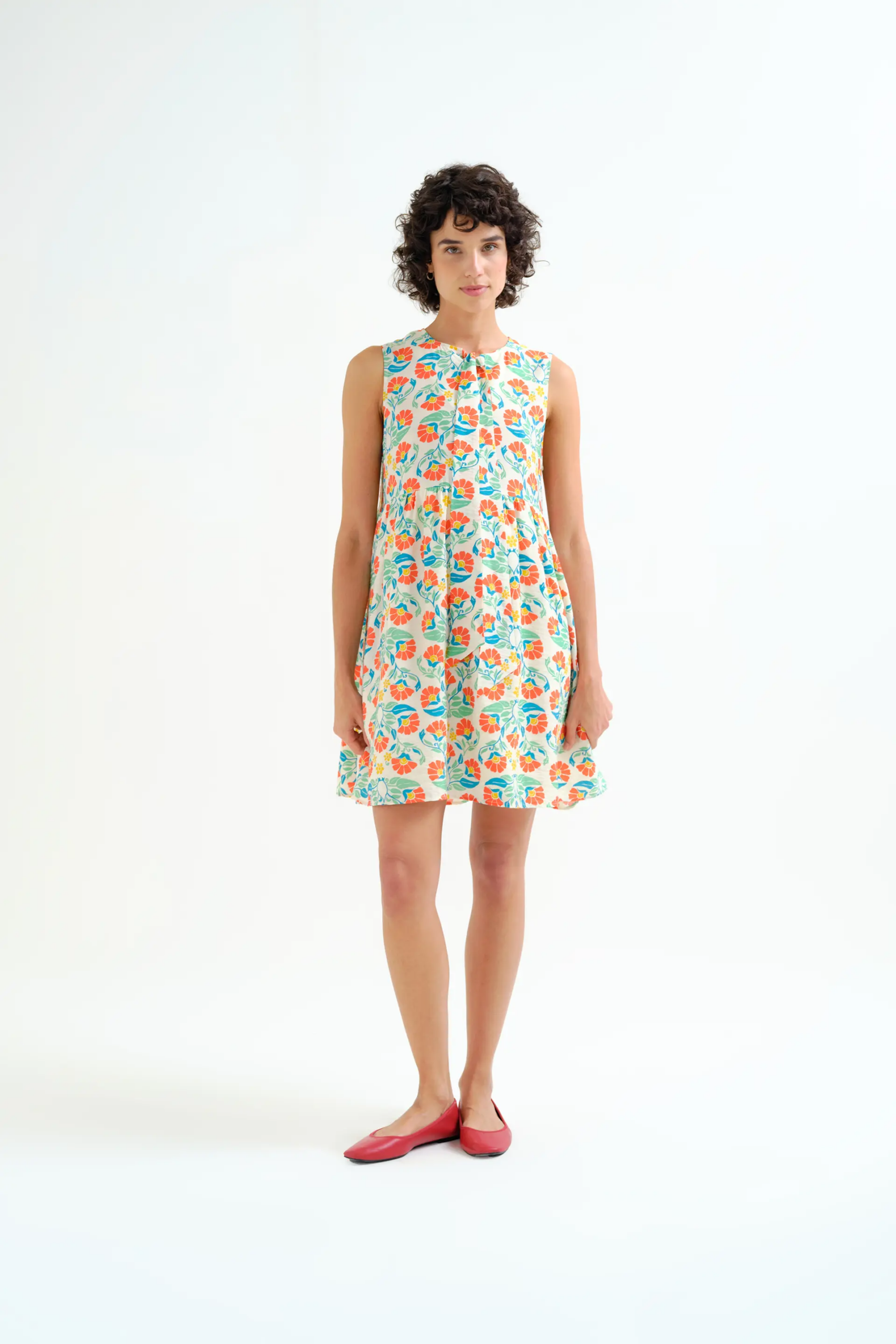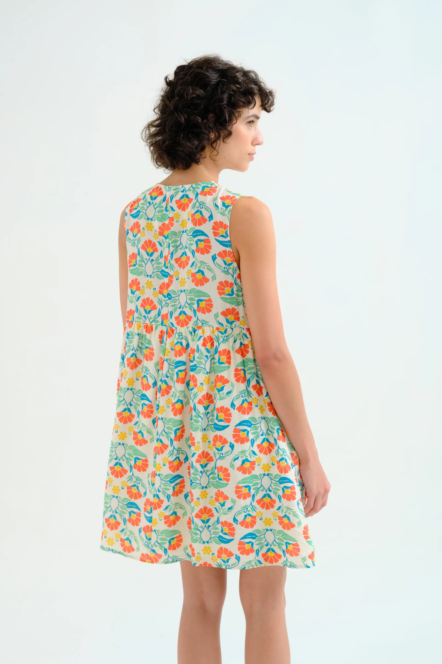 Κοντό κρεπ φόρεμα με μικρό Royal Print. Στρογγυλή λαιμόκοψη και αμάνικο.