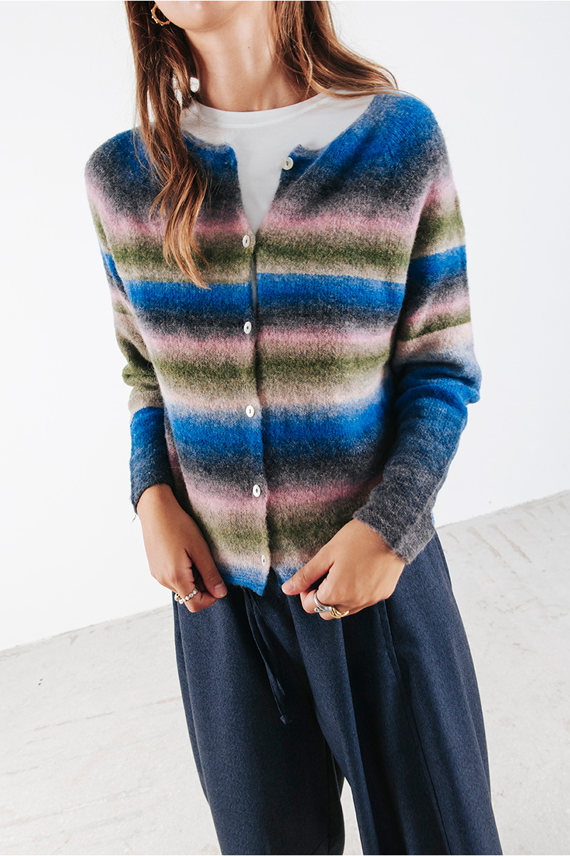 Λεπτή ζακέτα πλεκτή με στρογγυλή λαιμόκοψη και κλείσιμο μπροστά με κουμπιά.