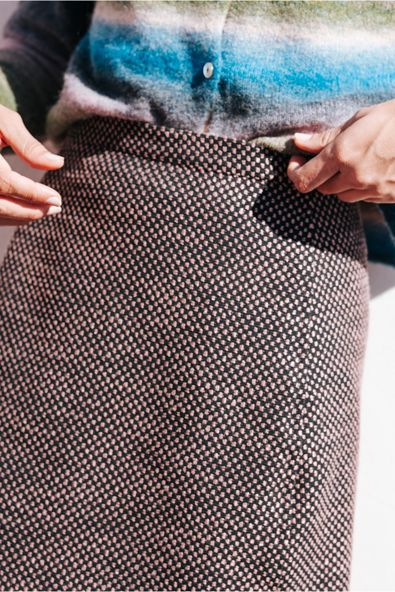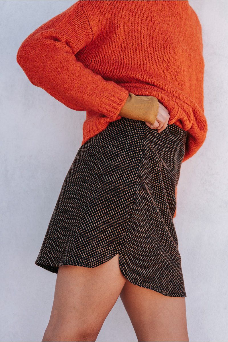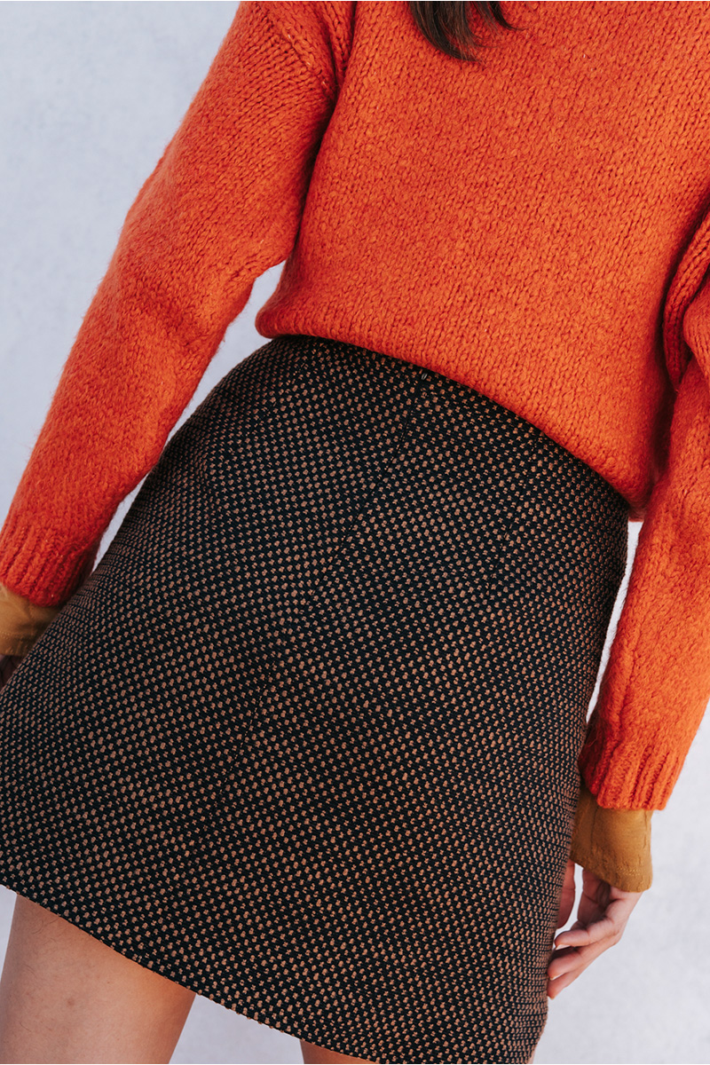 Μίνι ζακάρ φούστα με μικρά ανοίγματα μπροστά και φερμουάρ στο πίσω μέρος.