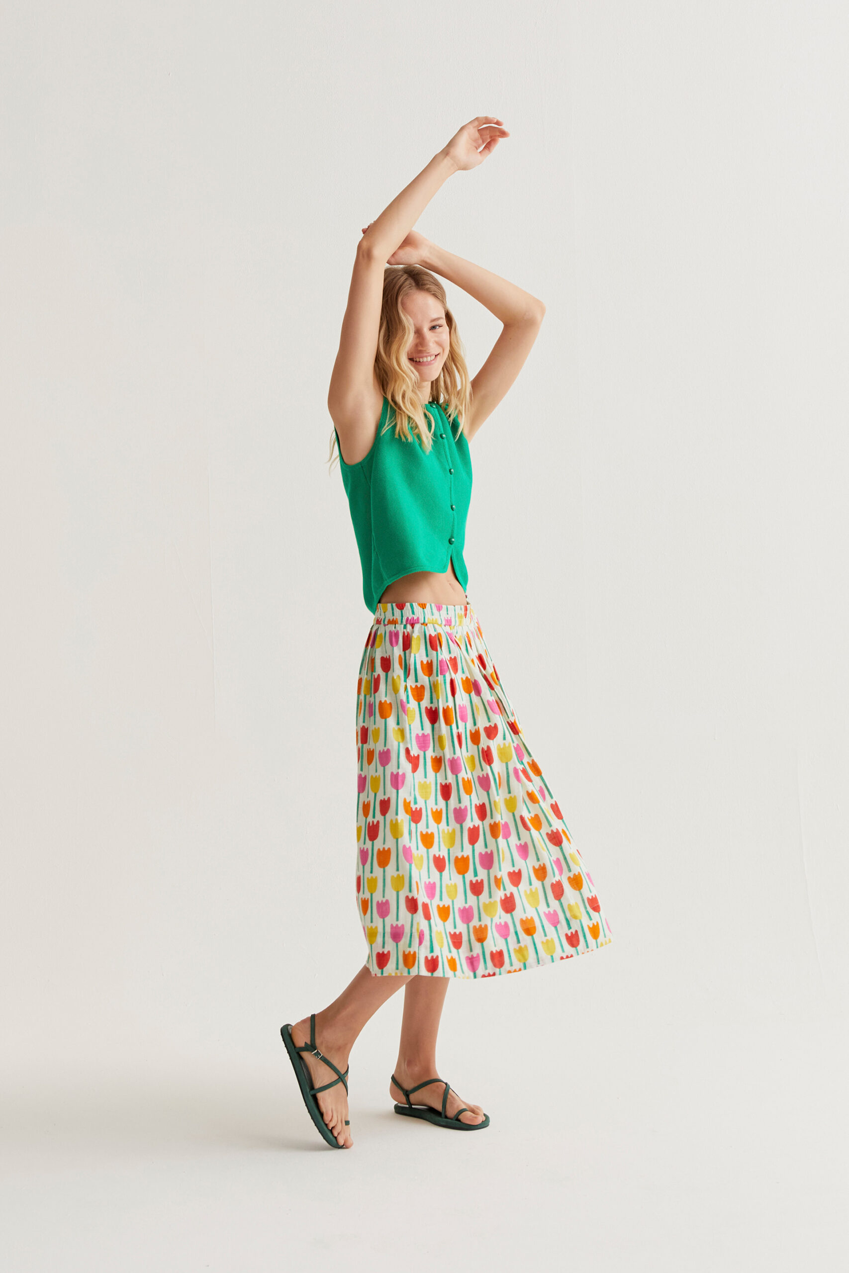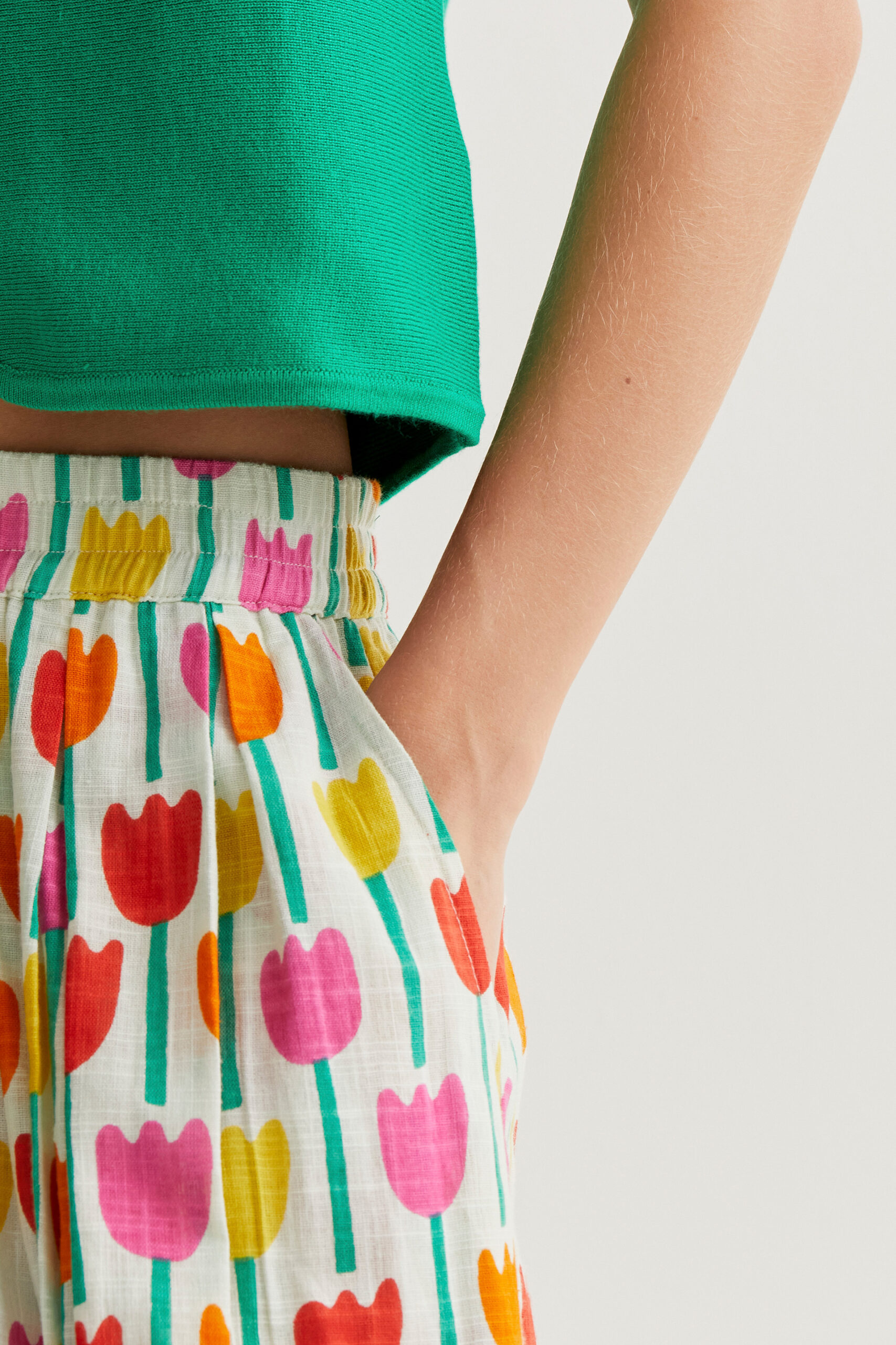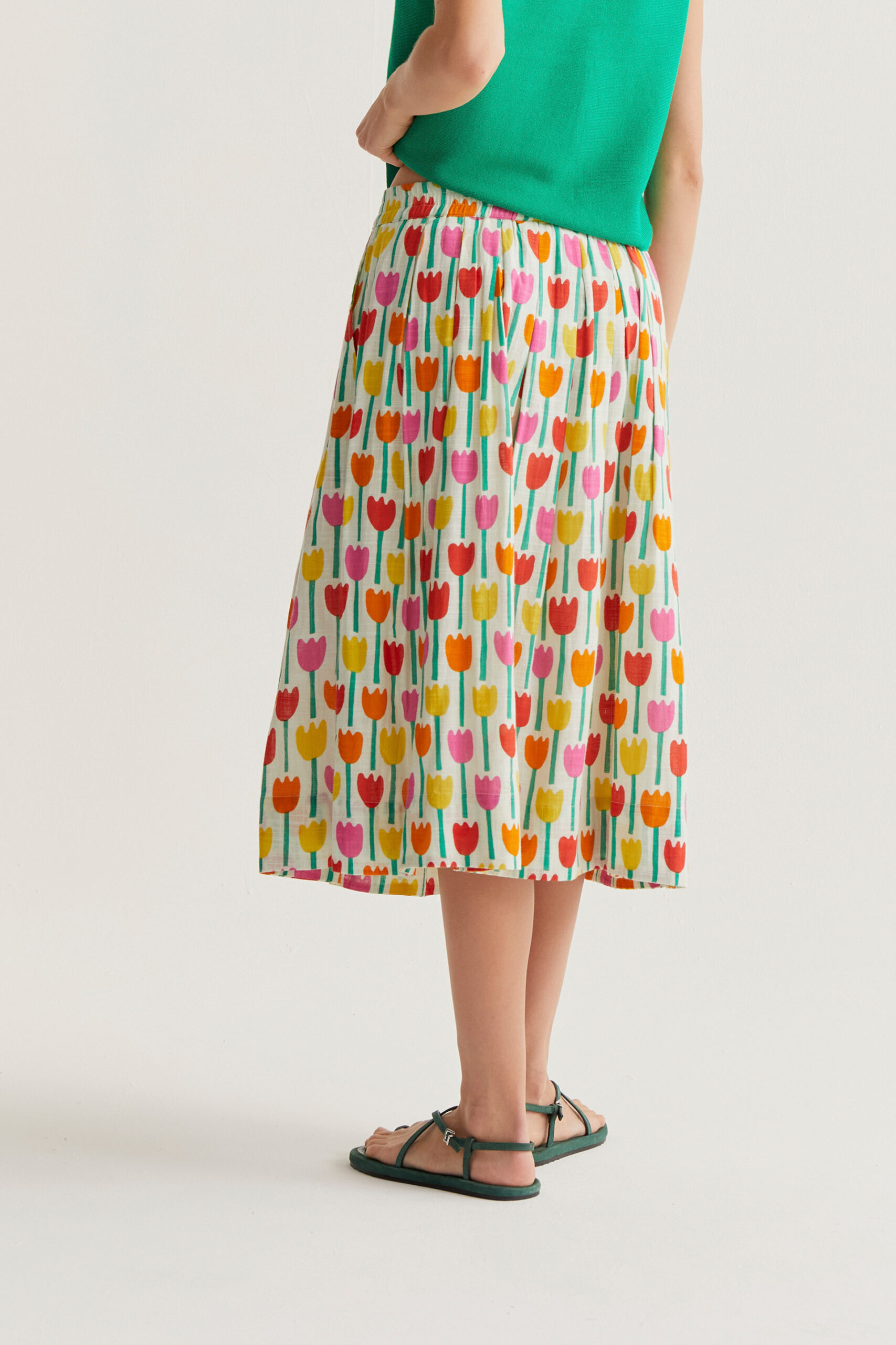 Μίντι φούστα από 100% βαμβάκι με τύπωμα πολύχρωμες τουλίπες.