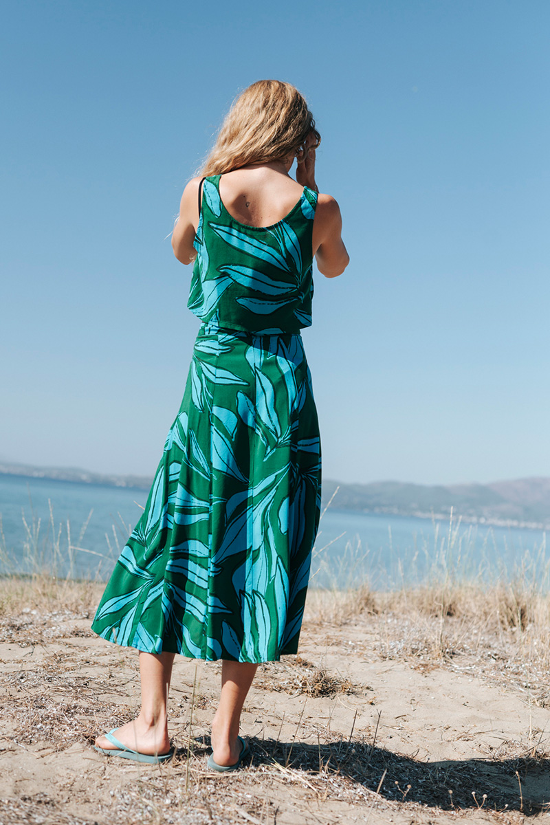 Μίντι εμπριμέ φαρδιά φούστα. Κλείσιμο στο πίσω μέρος με κρυφό φερμουάρ.