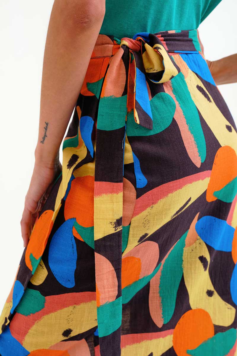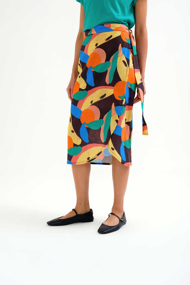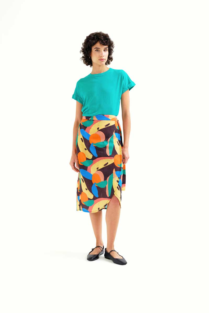 Μίντι φούστα κρουαζέ από 100% βαμβάκι με μεγάλο τύπωμα tutti frutti.