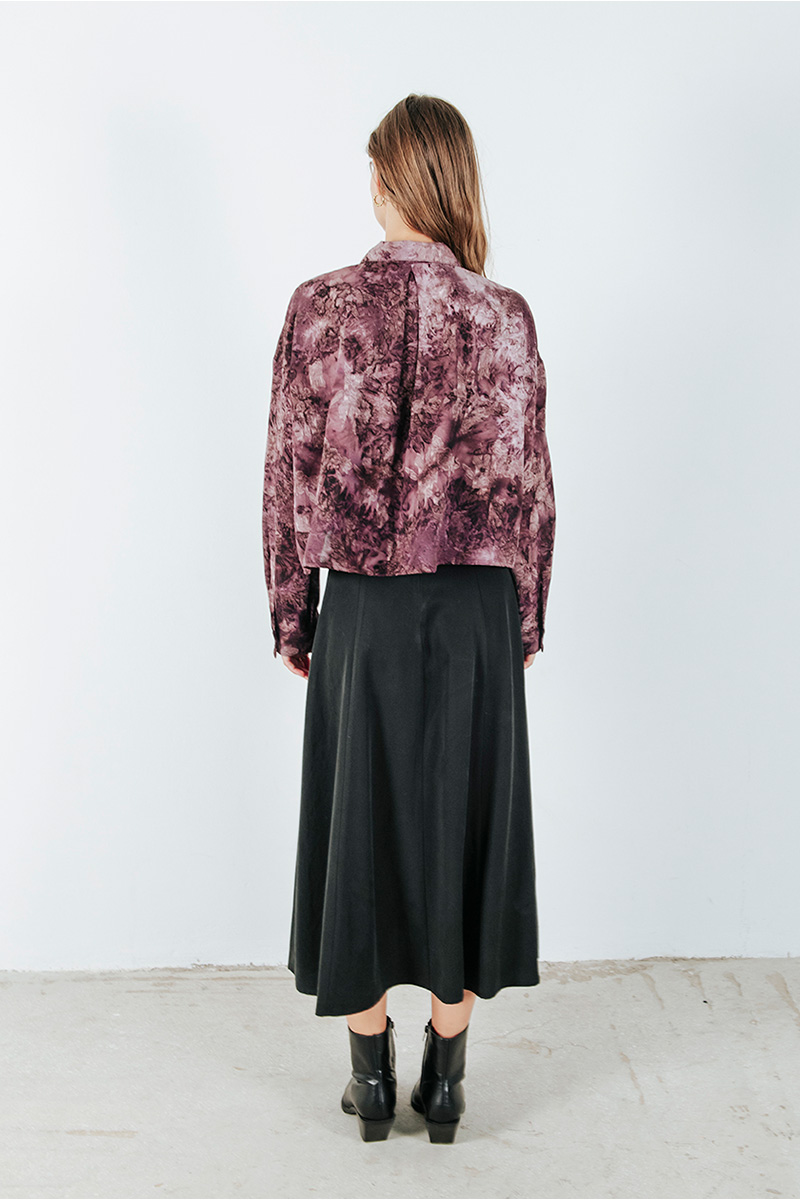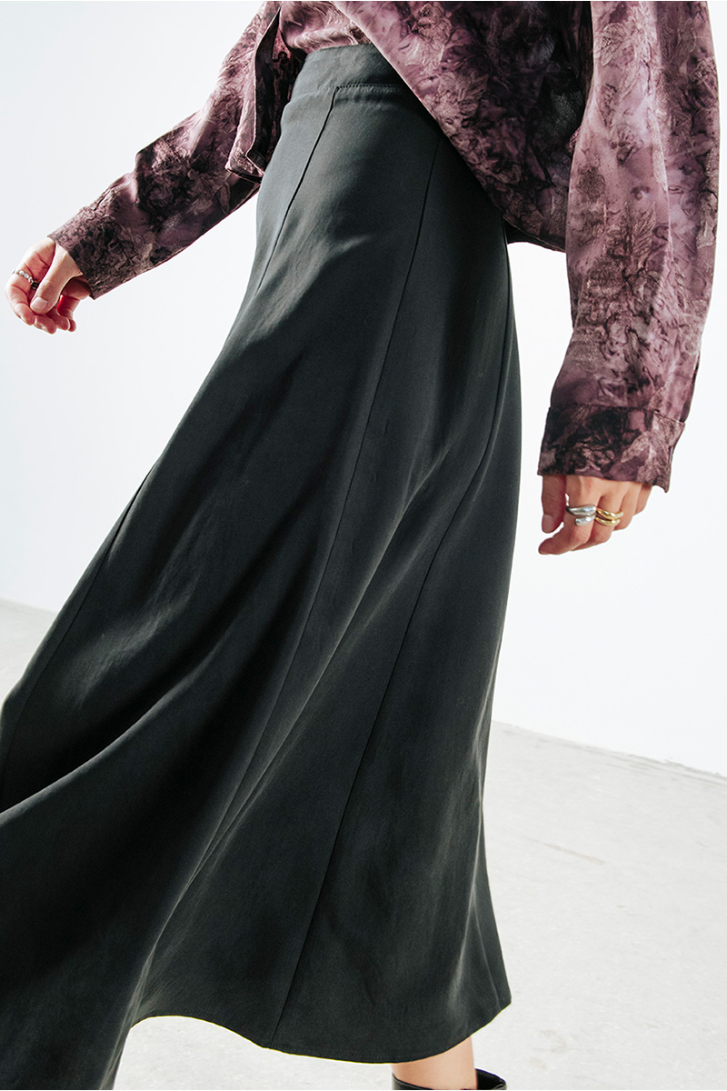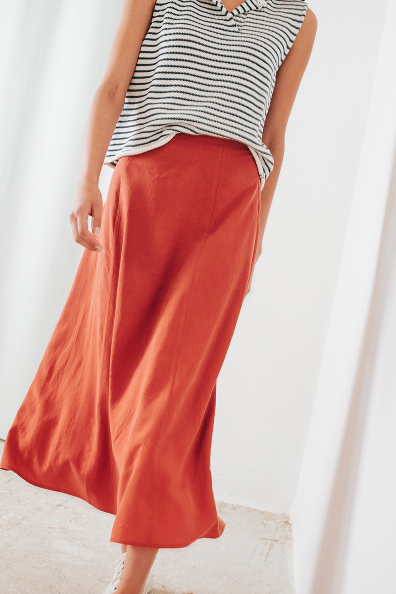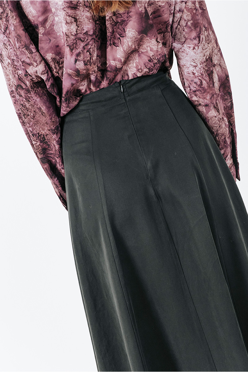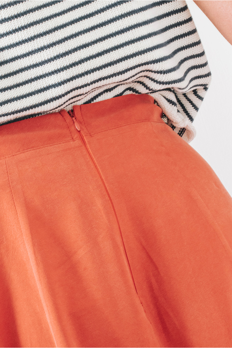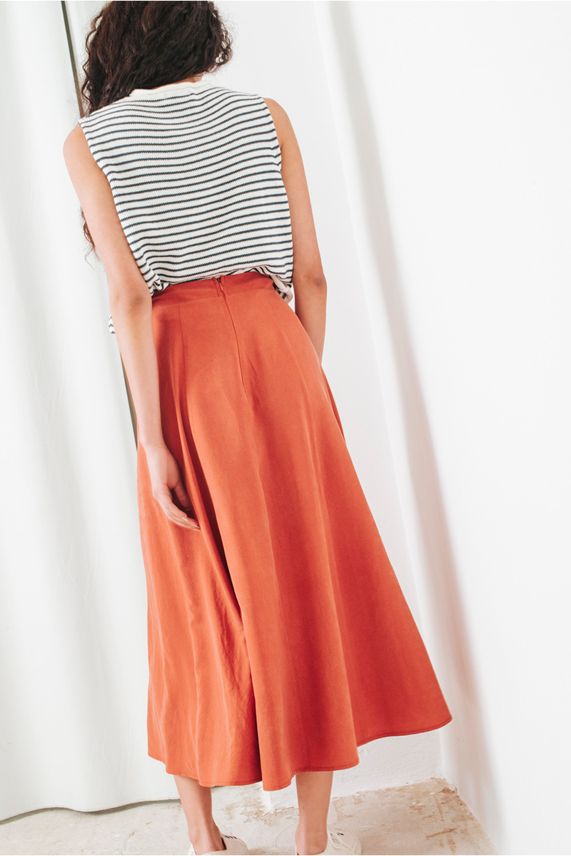 Μίντι φαρδιά φούστα. Κλείσιμο στο πίσω μέρος με κρυφό φερμουάρ.