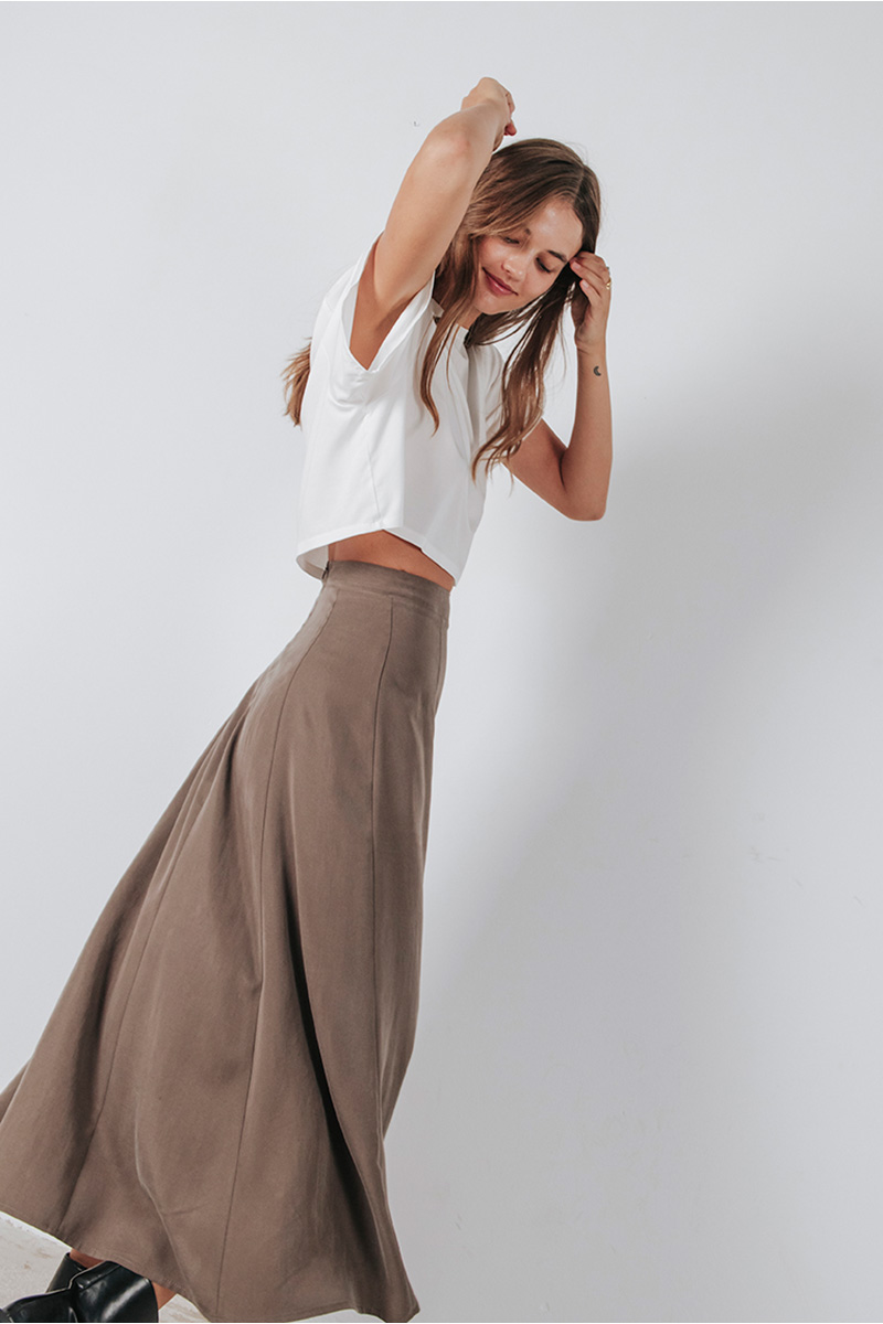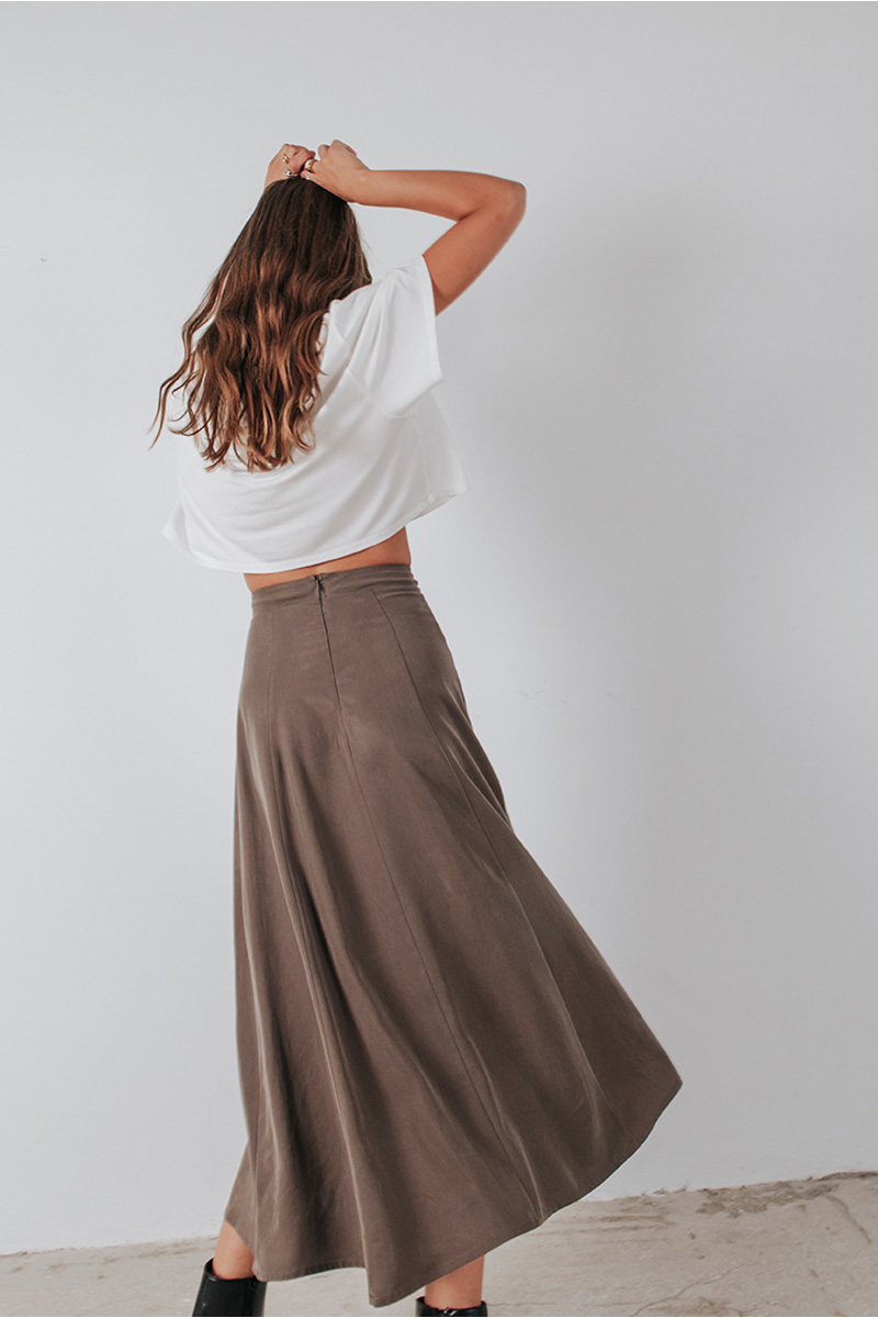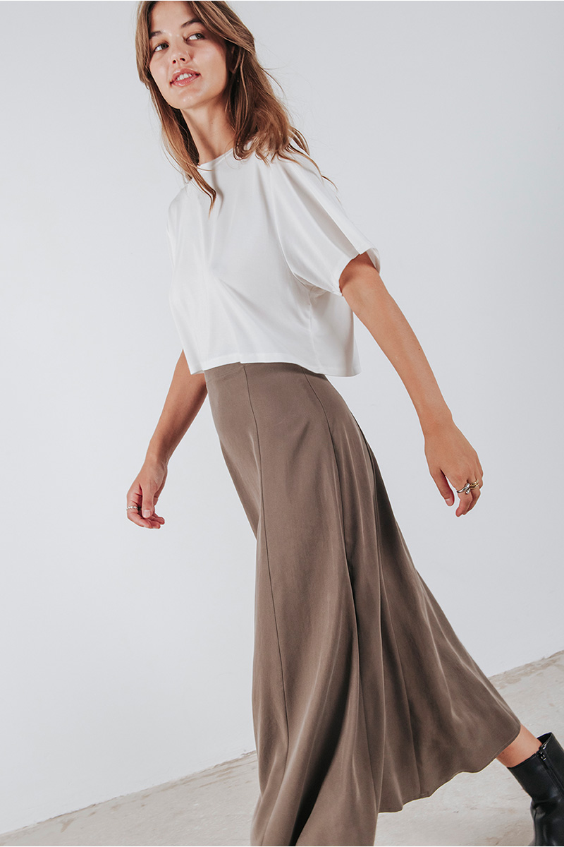 Μίντι φαρδιά φούστα. Κλείσιμο στο πίσω μέρος με κρυφό φερμουάρ.