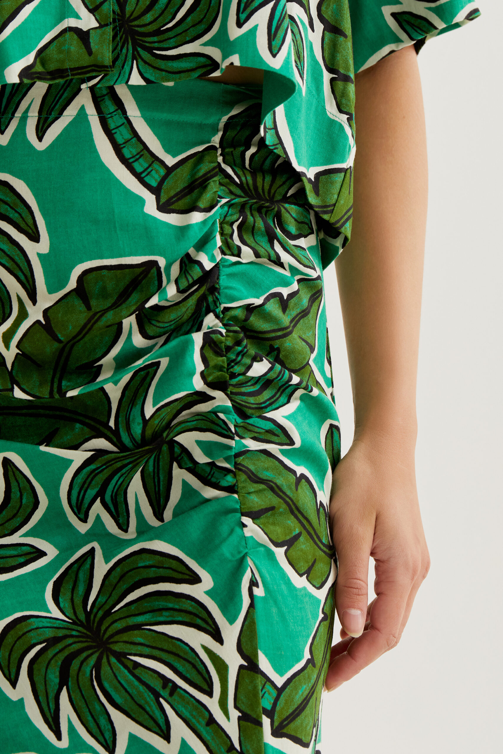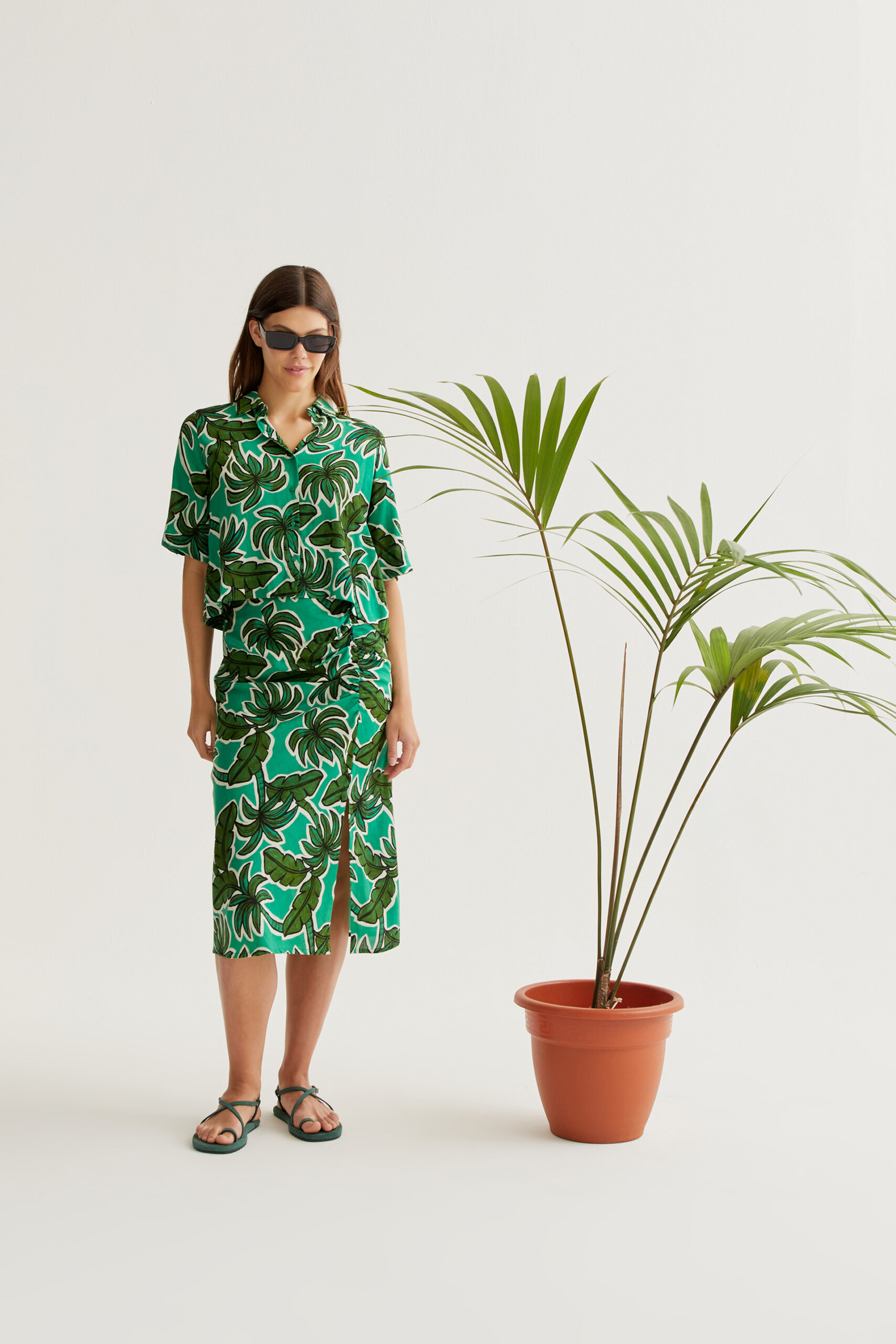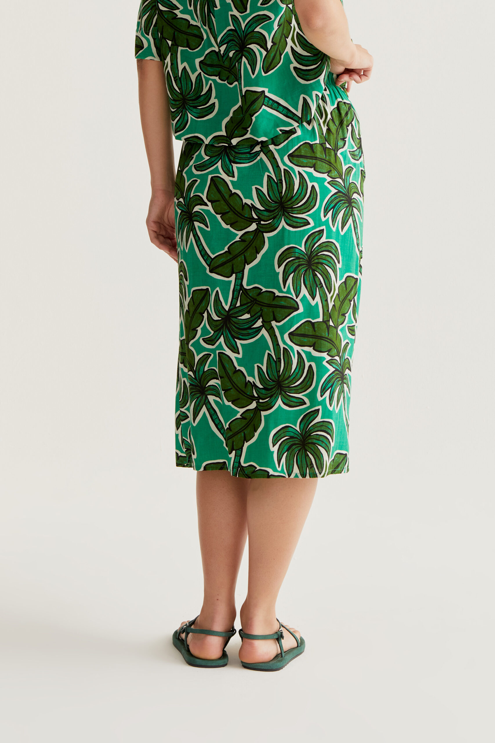 Μίντι φούστα με τύπωμα φοίνικα. Ψηλόμεση ελαστική ζώνη. Ελαφρύ σκίσιμο μπροστά.