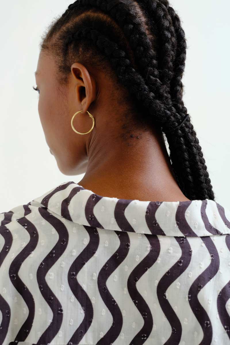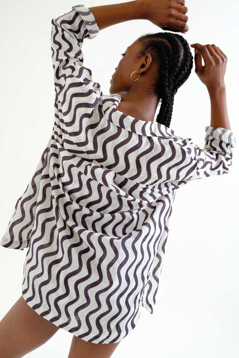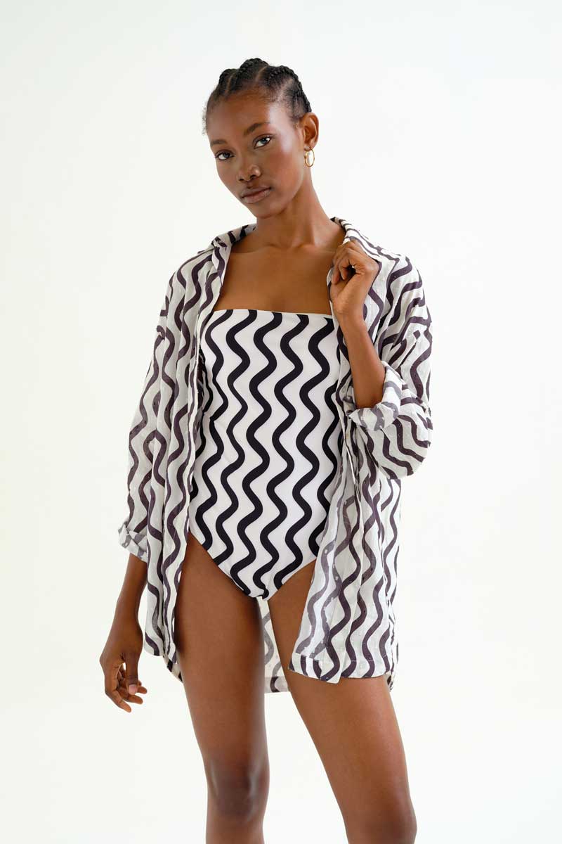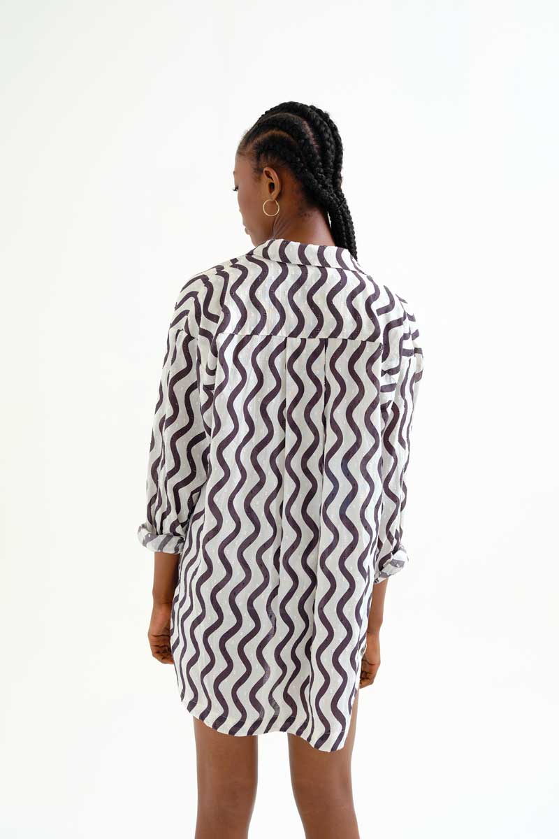 Μακρύ βαμβακερό πουκάμισο καφτάνι με Wave ασπρόμαυρο τύπωμα.