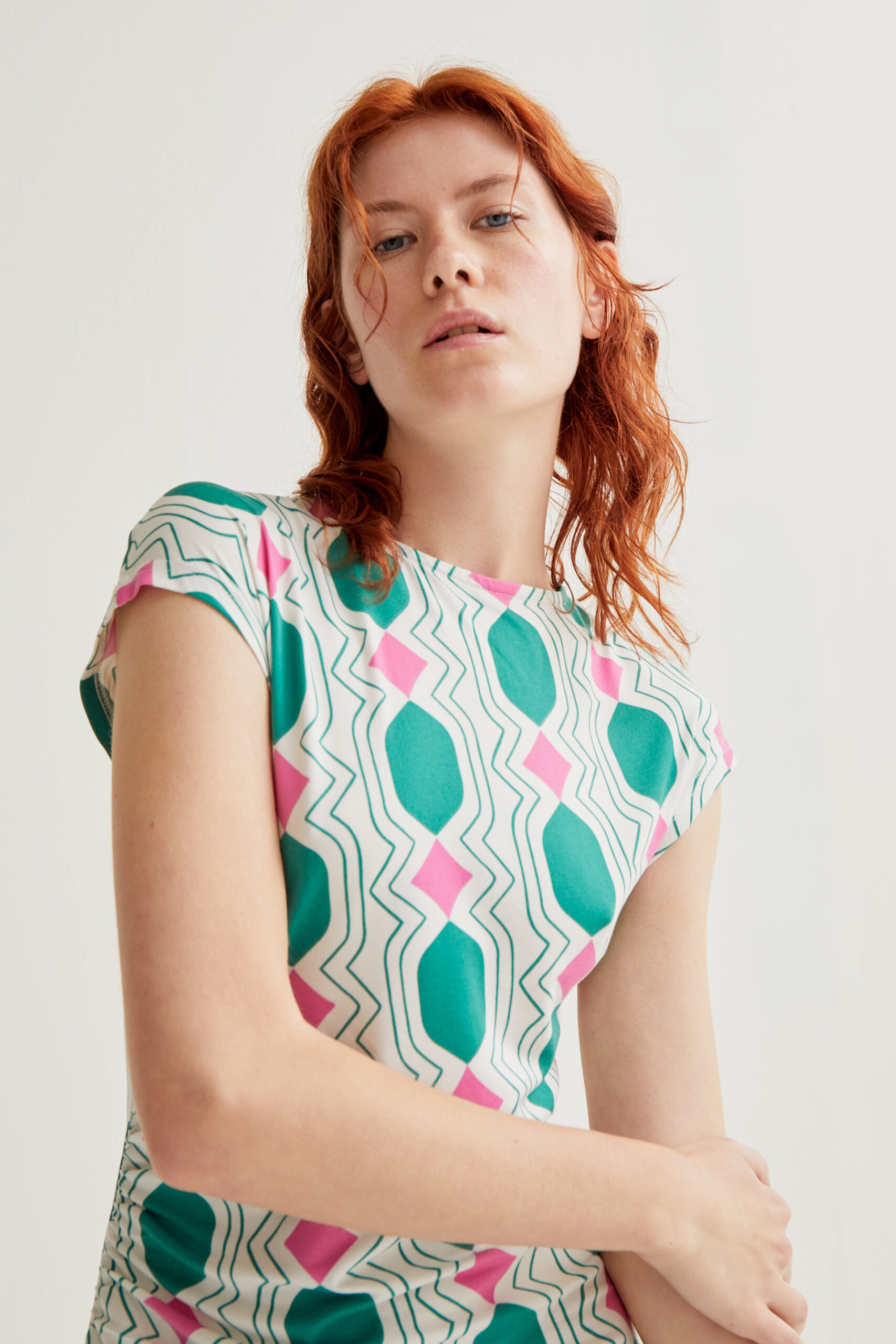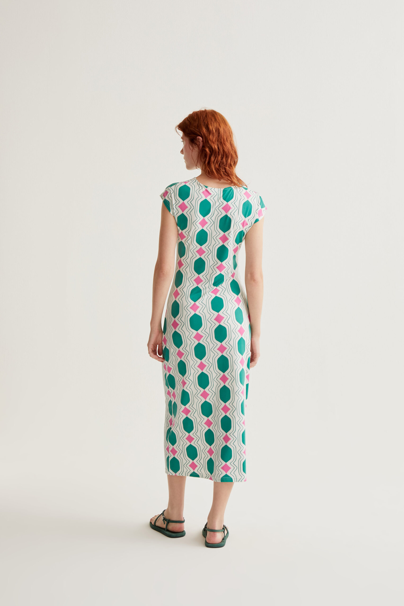 Μακρύ φόρεμα από ύφασμα ζέρσεϊ με γεωμετρικό τύπωμα.