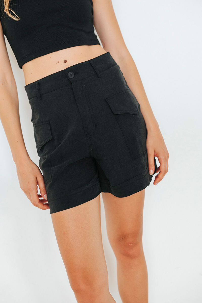 Σόρτς με ρεβέρ τσέπες patch στο πλάι και κλείσιμο μπροστά με φερμουάρ και κουμπί.