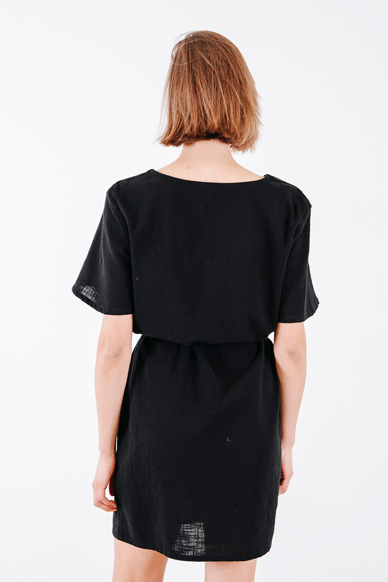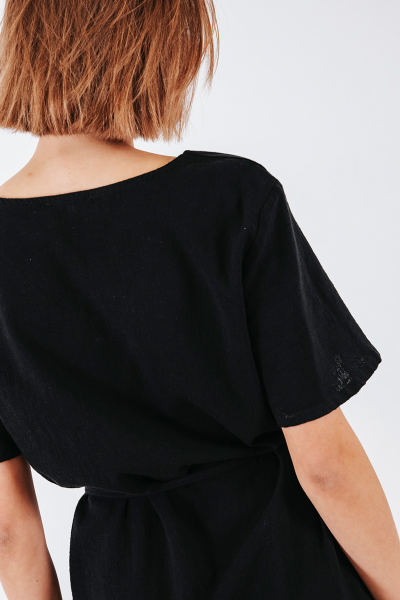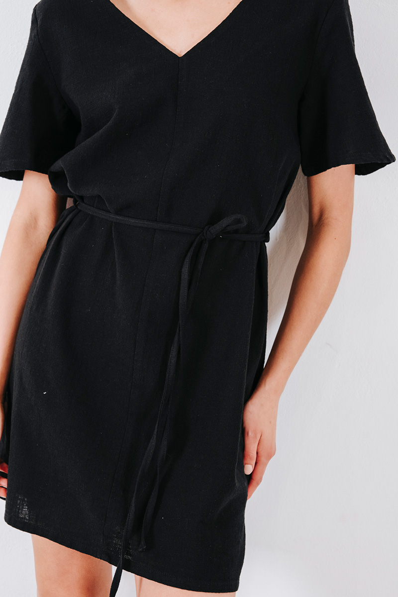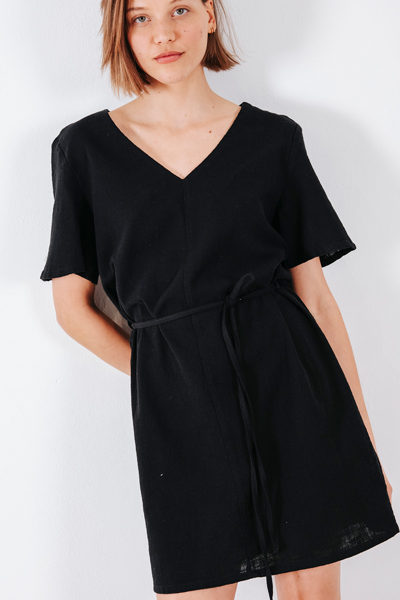 Μίνι φόρεμα με V λαιμόκοψη και λεπτή ζώνη από το ίδιο ύφασμα.
