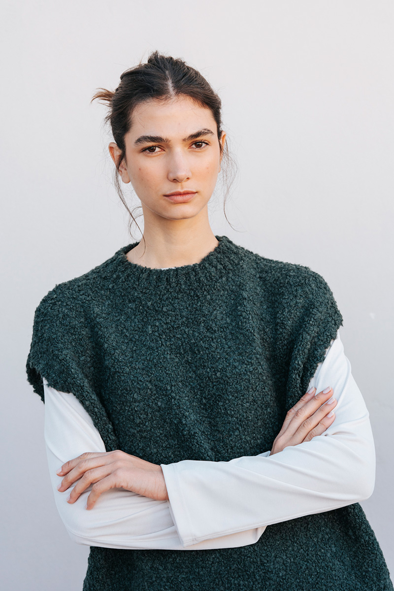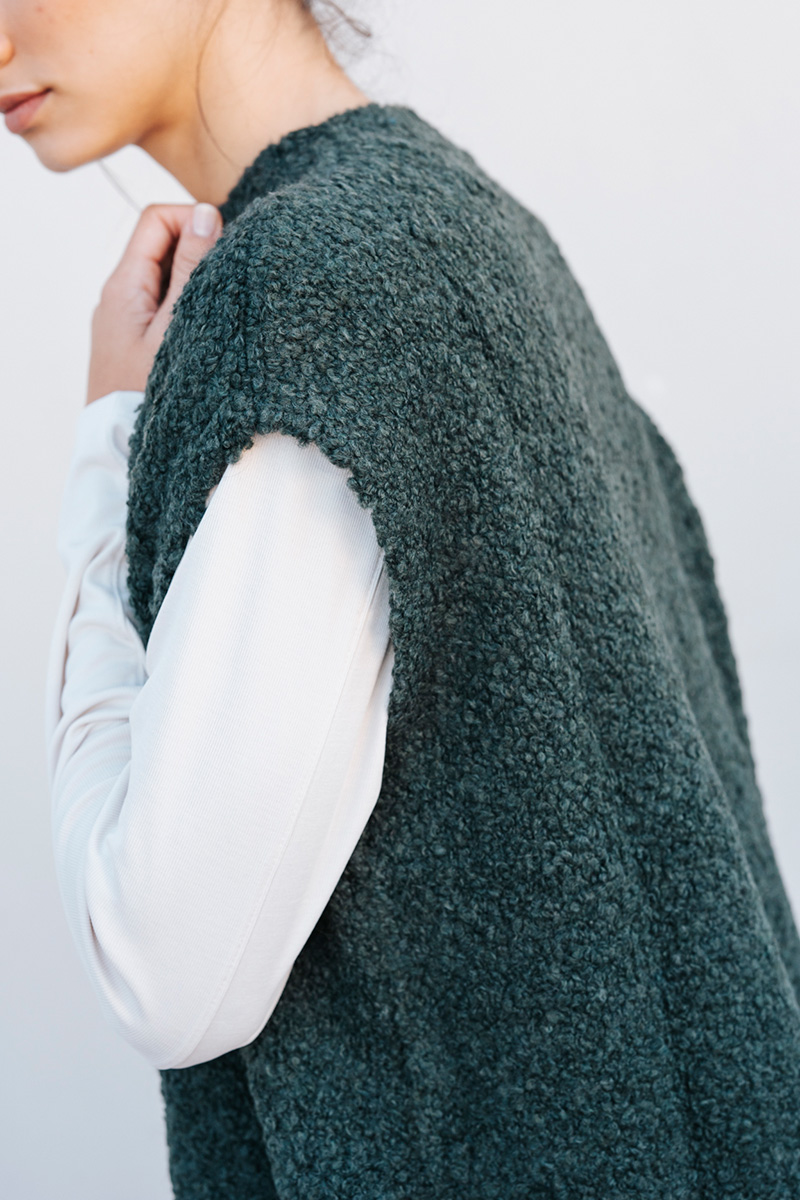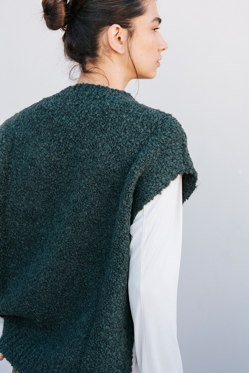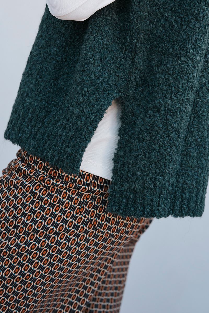 Πλεκτή καζάκα μπουκλέ, με στρογγυλή λαιμόκοψη και μικρά ανοίγματα στο πλάι.