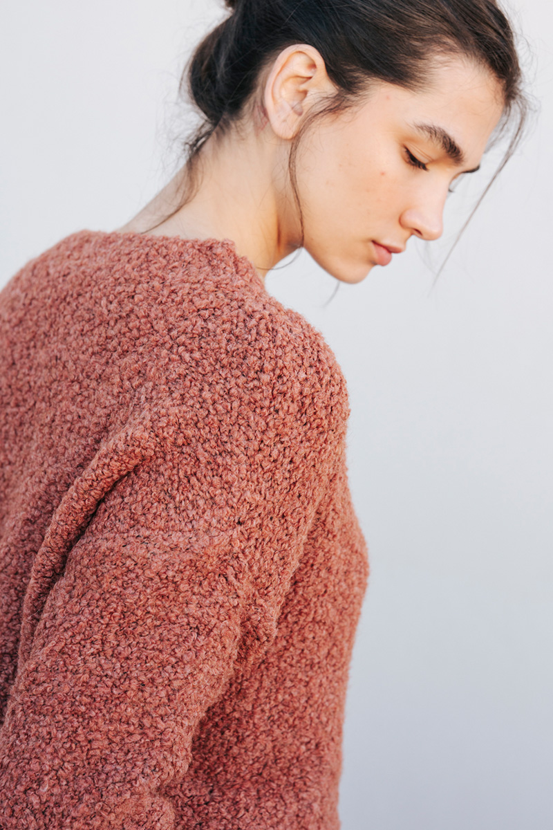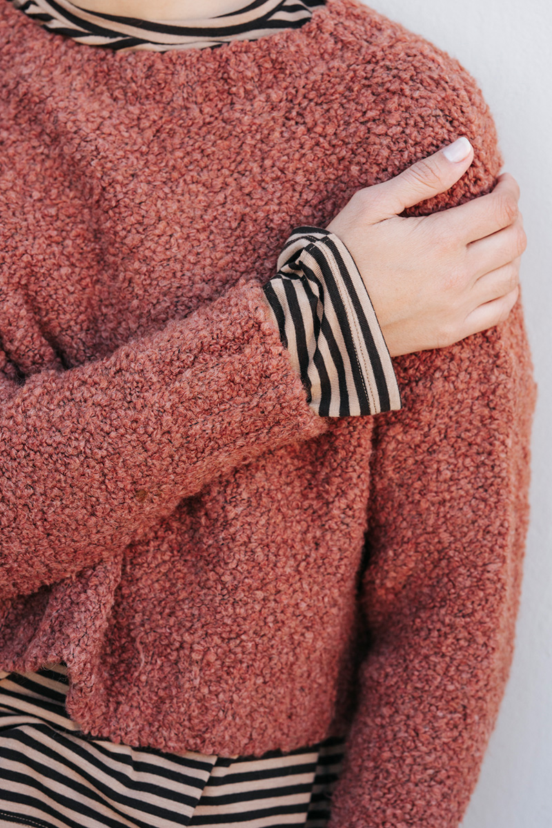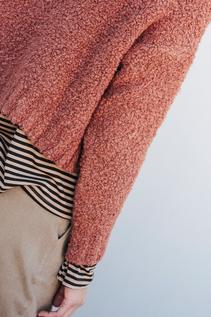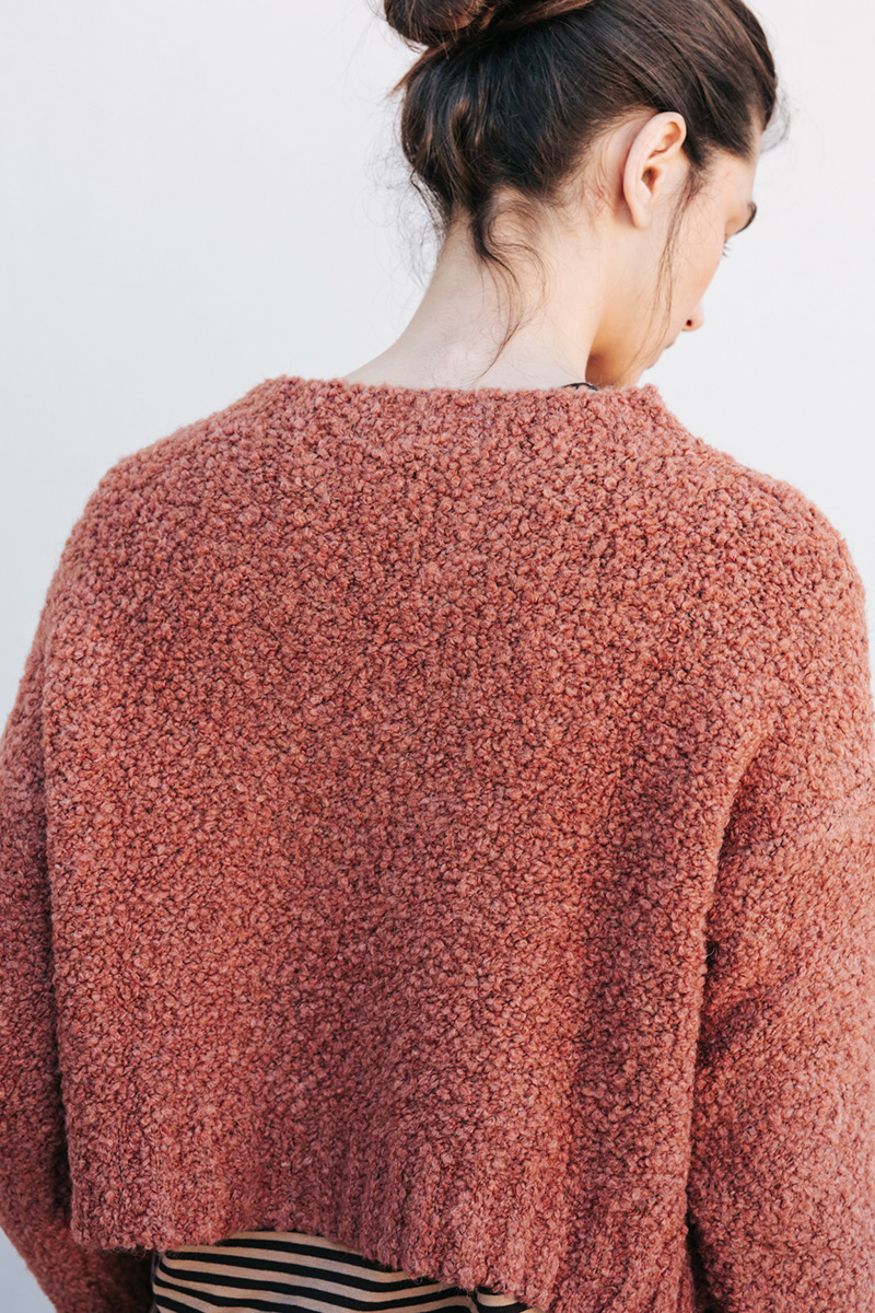 Πλεκτό πουλόβερ μπουκλέ κοντό και στρογγυλή λαιμόκοψη.