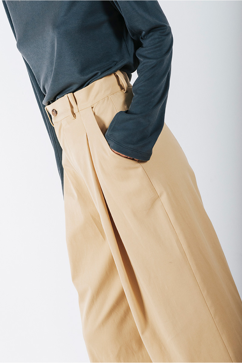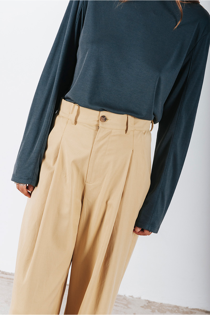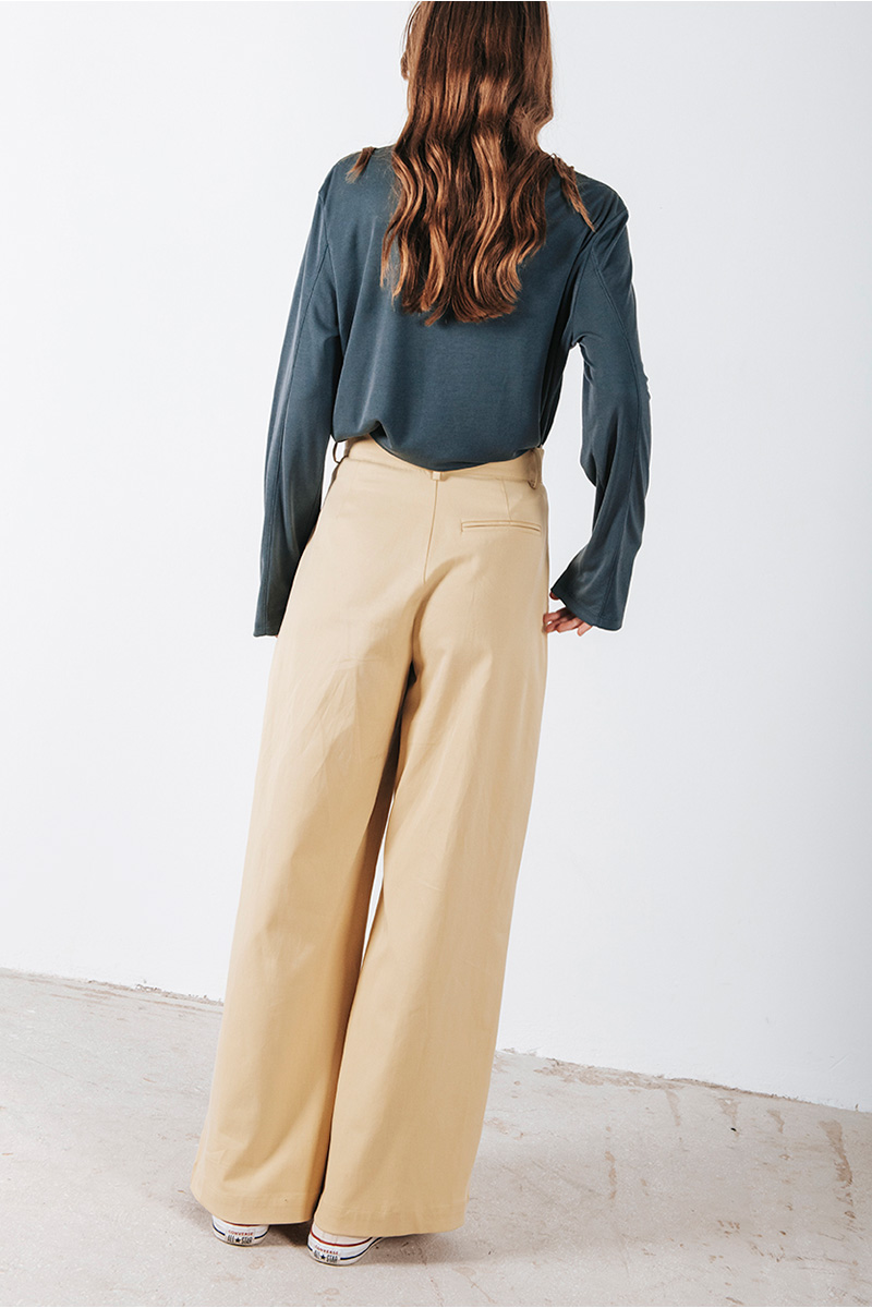 Φαρδύ παντελόνι σε ίσια γραμμή, με τσέπες στο πλαί, πιέτες στο ζωνάκι και κλείσιμο μπροστά με φερμουάρ και κουμπί.