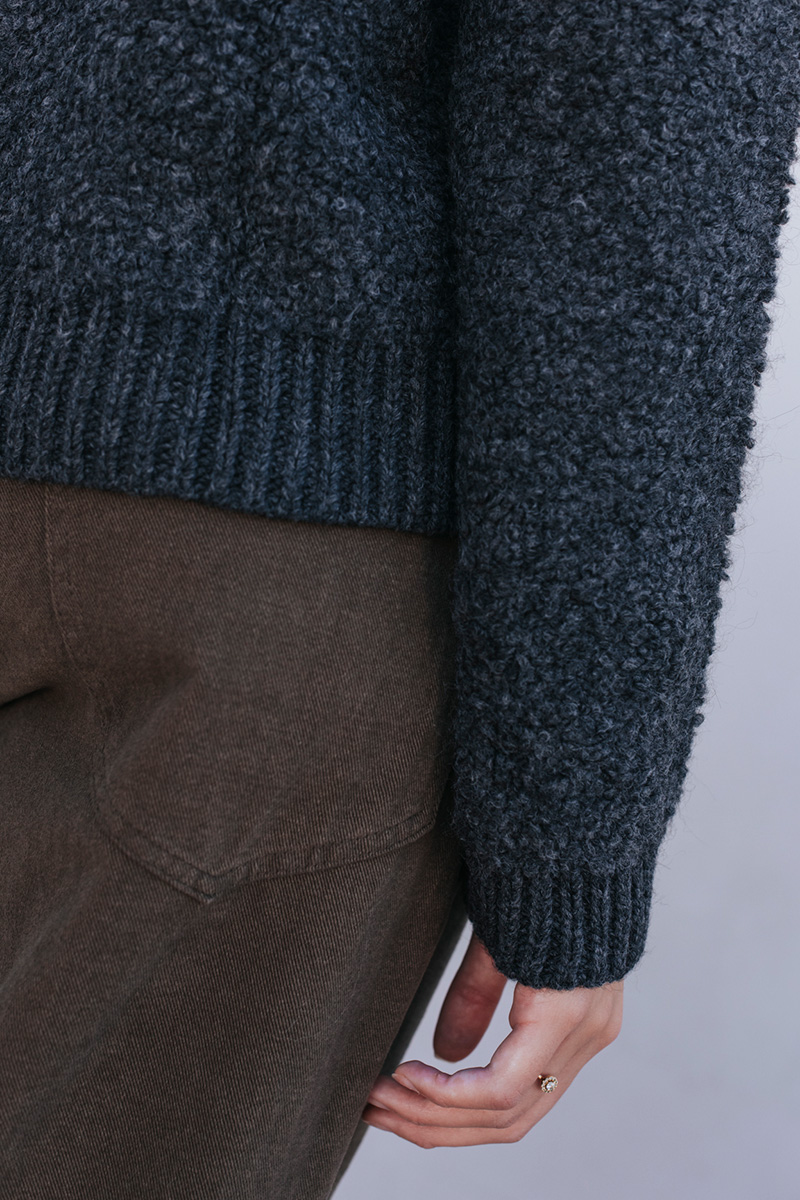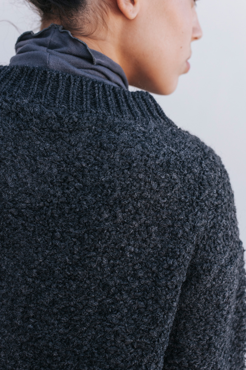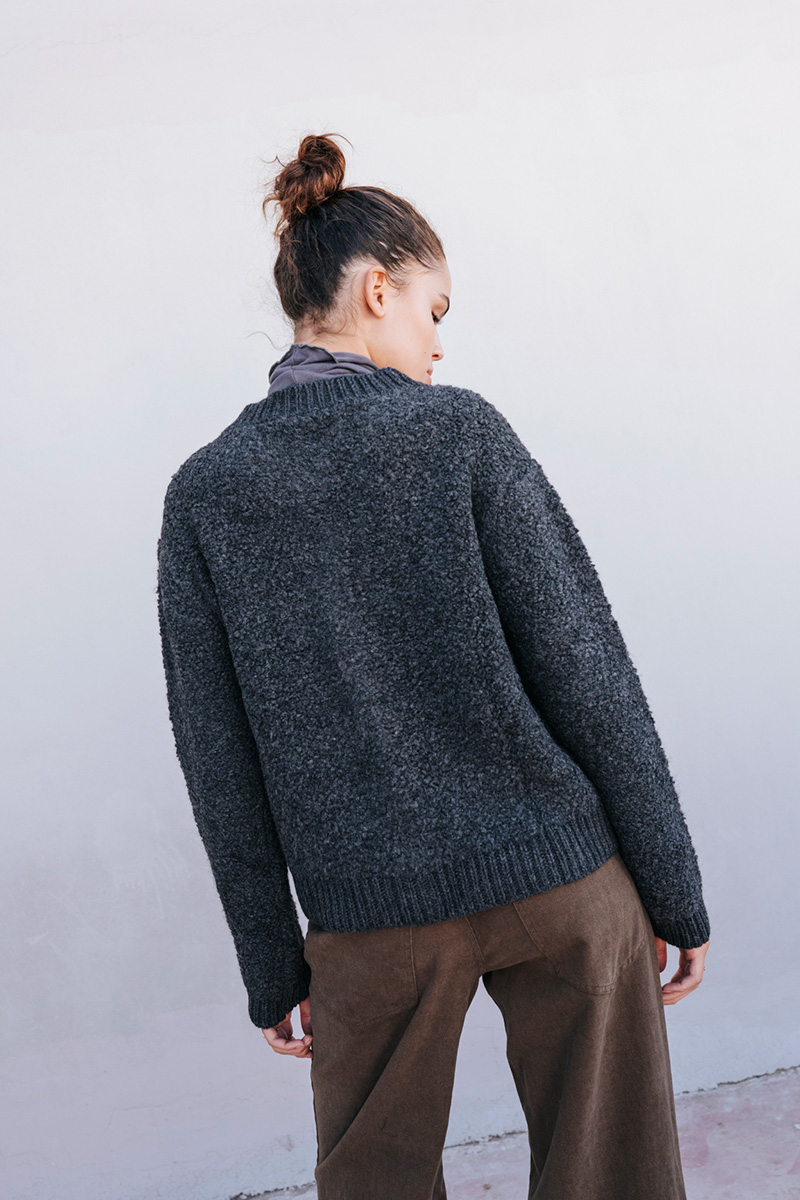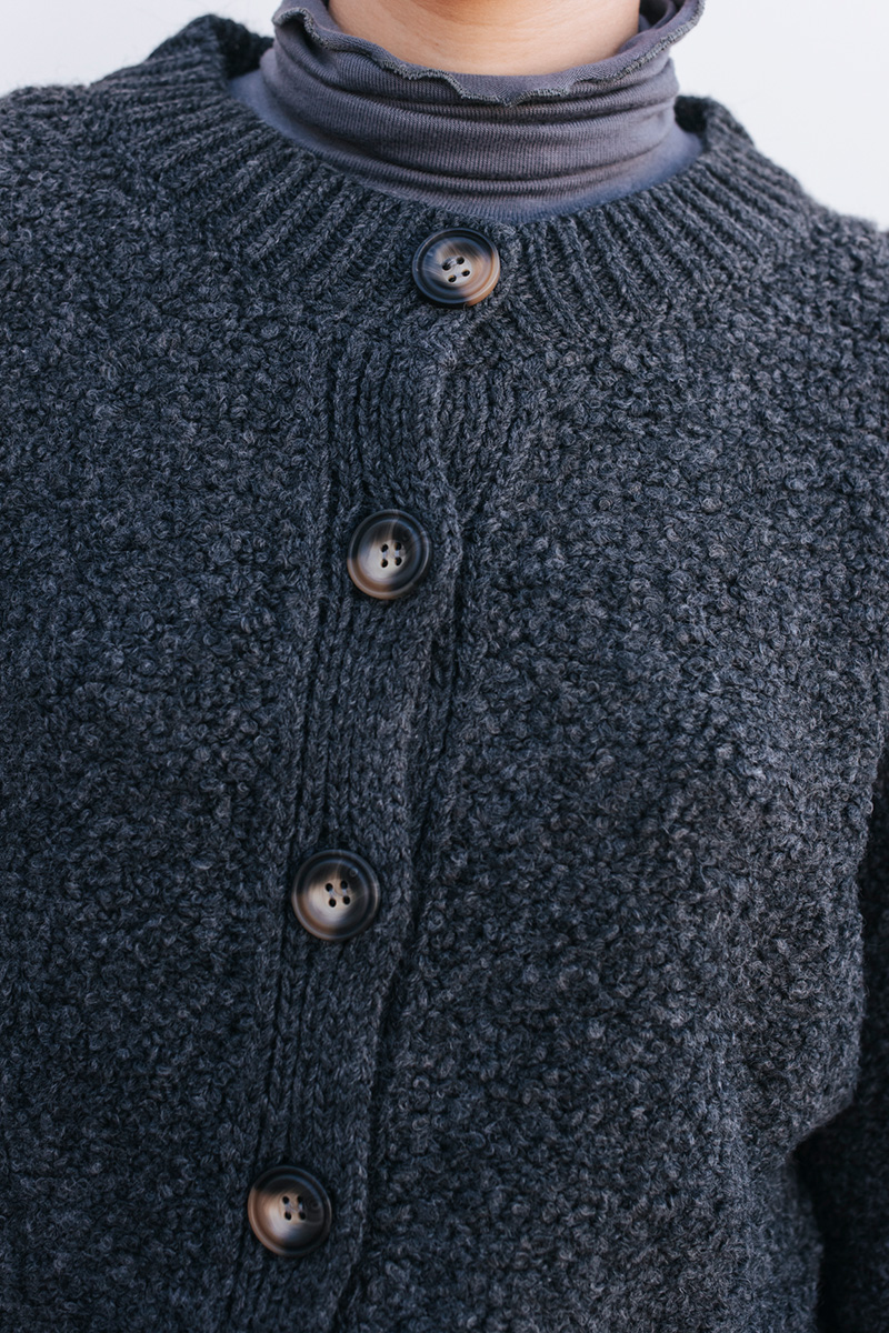 Μπουκλέ ζακέτα πλεκτή, κλείσιμο με κουμπιά μπροστά.