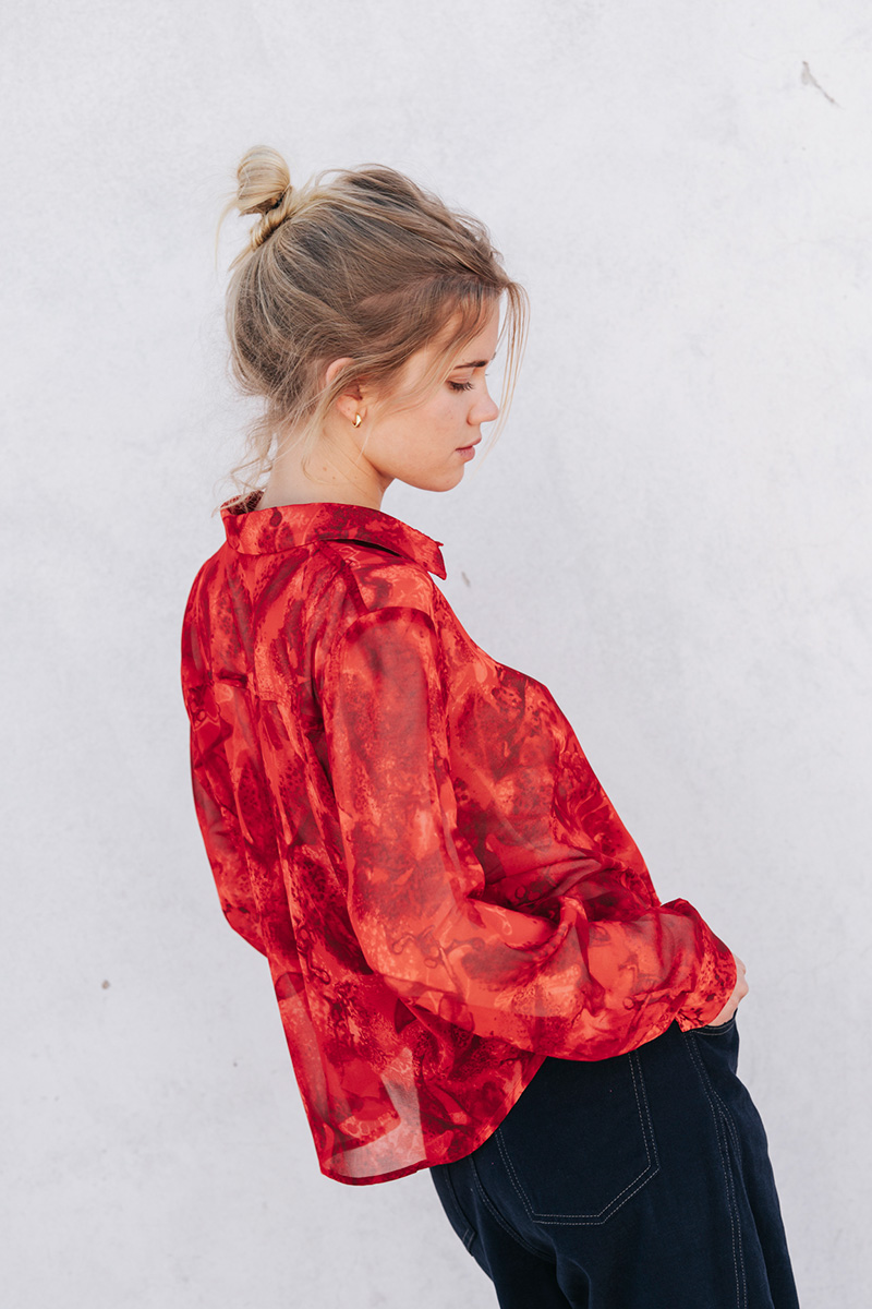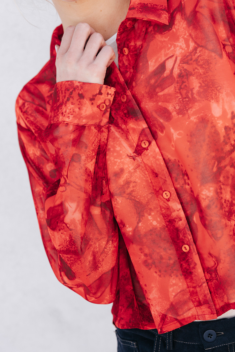 Εμπριμέ see-through πουκάμισο κοντό με γιακά. Κλείσιμο μπροστά με κουμπιά.