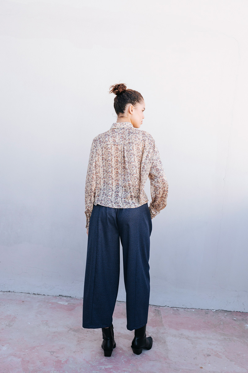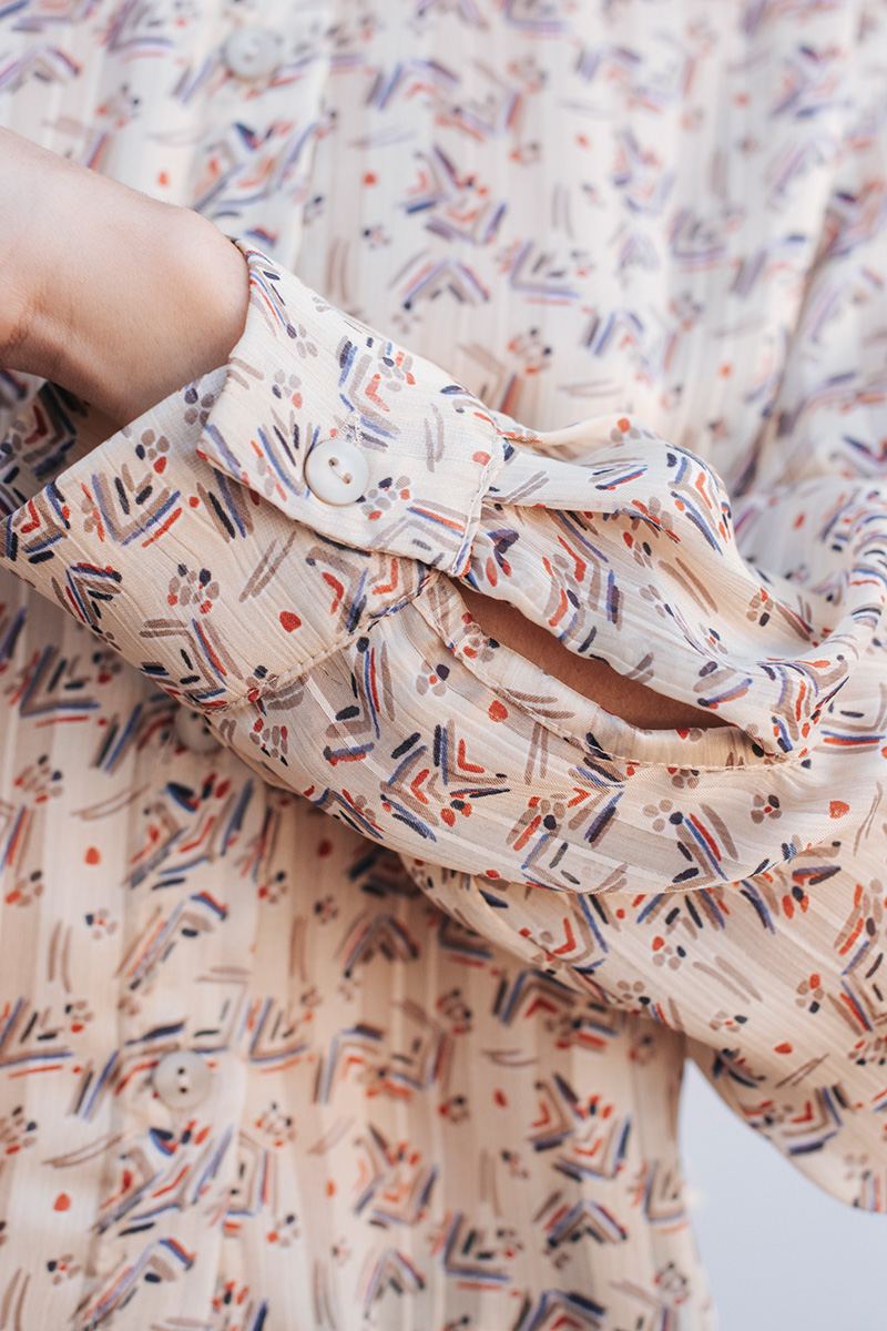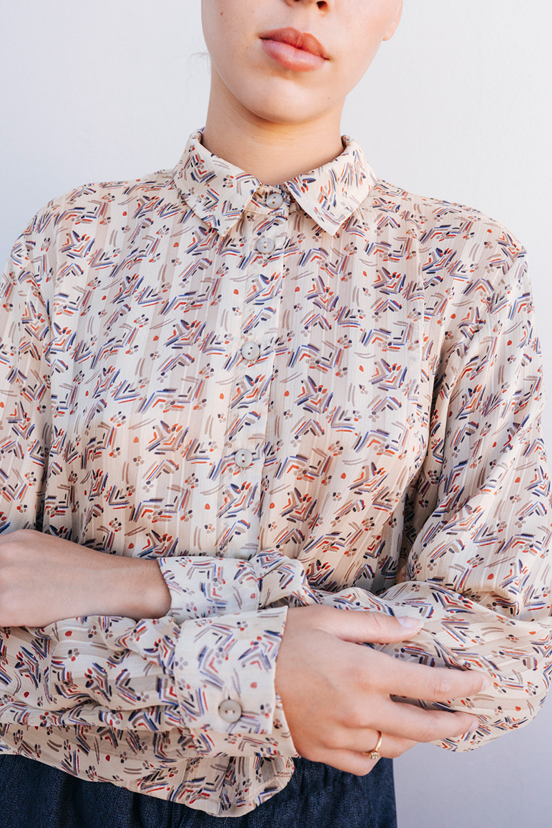 Εμπριμέ see-through πουκάμισο κοντό με γιακά. Κλείσιμο μπροστά με κουμπιά.
