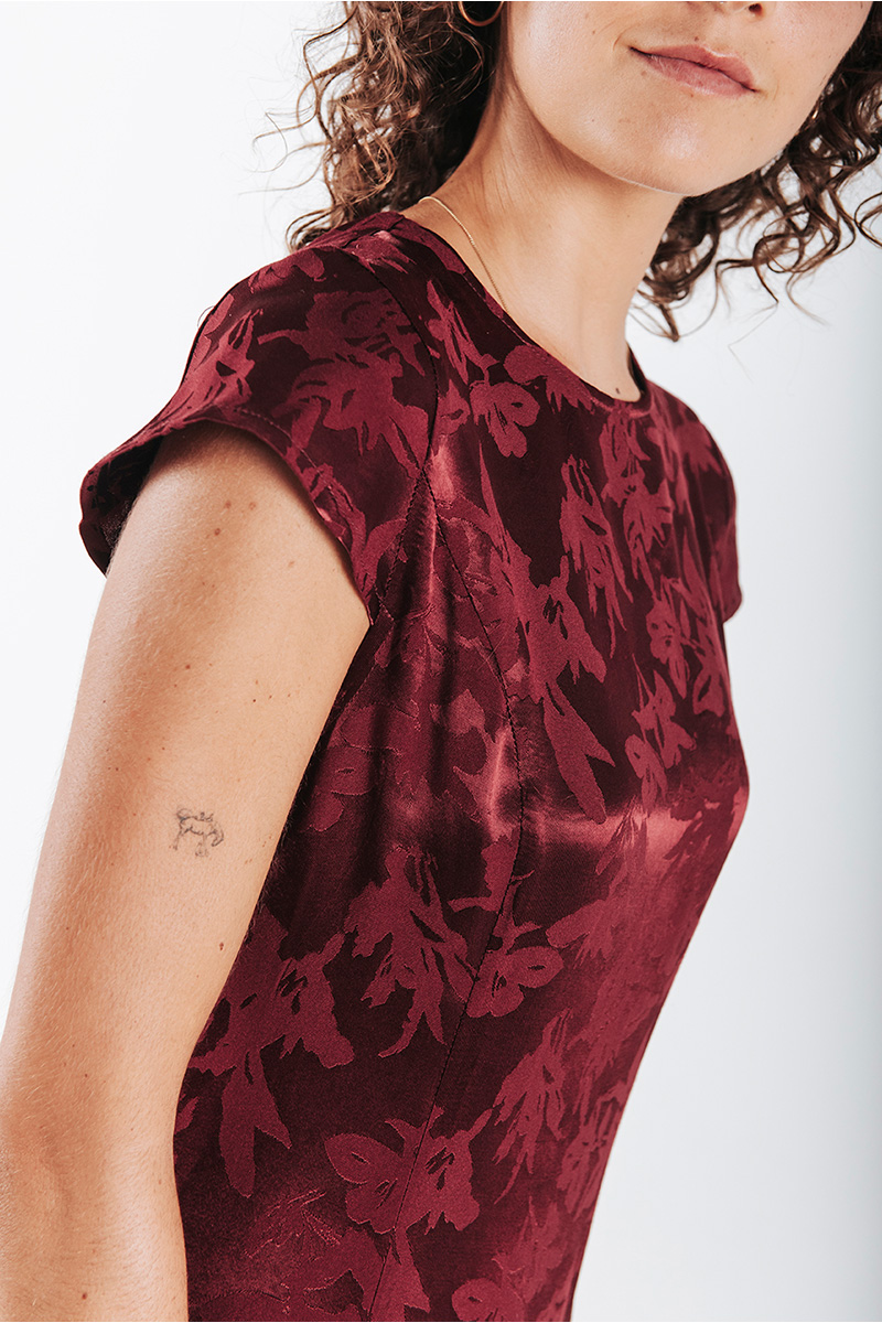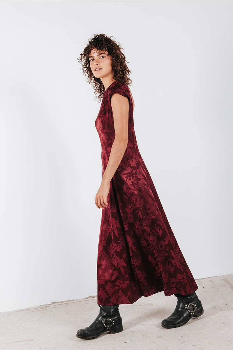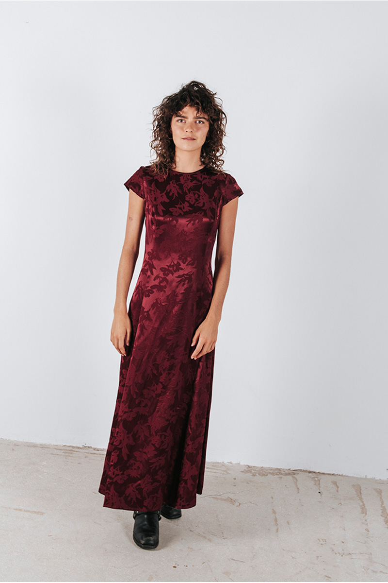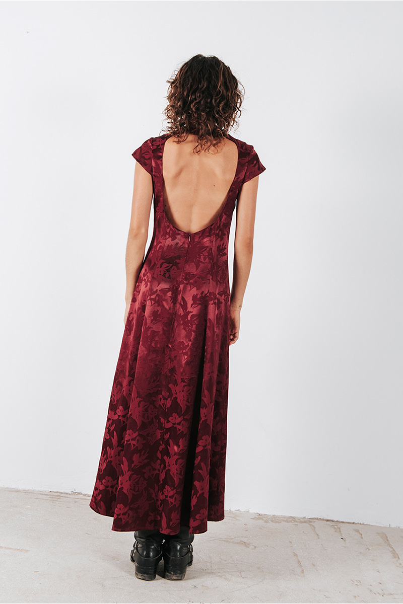 Φόρεμα ζακάρ σατέν με ανοιχτή πλάτη, κούμπωμα πίσω με κουμπιά και φερμουάρ.