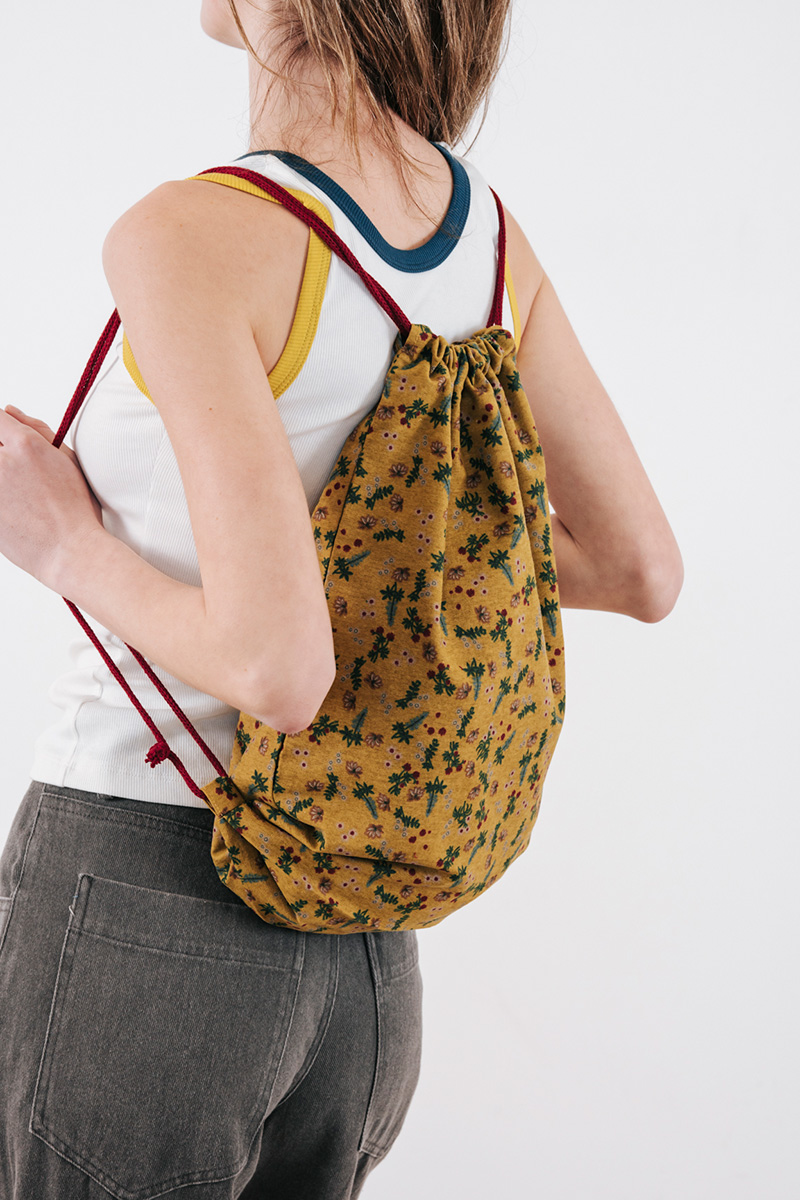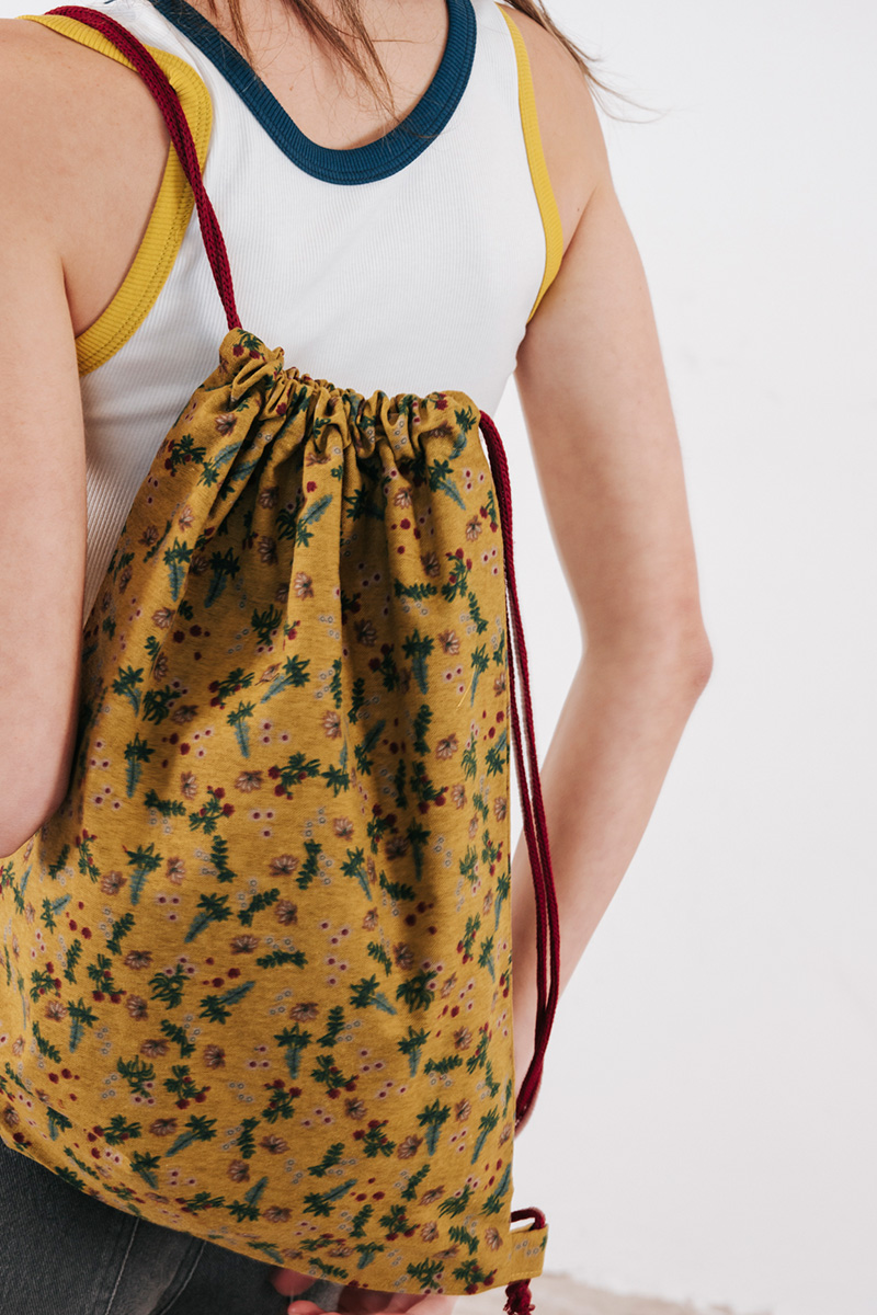 Εμπριμέ τσάντα πλάτης. Κλείσιμο με κορδόνια. 44εκ * 33εκ