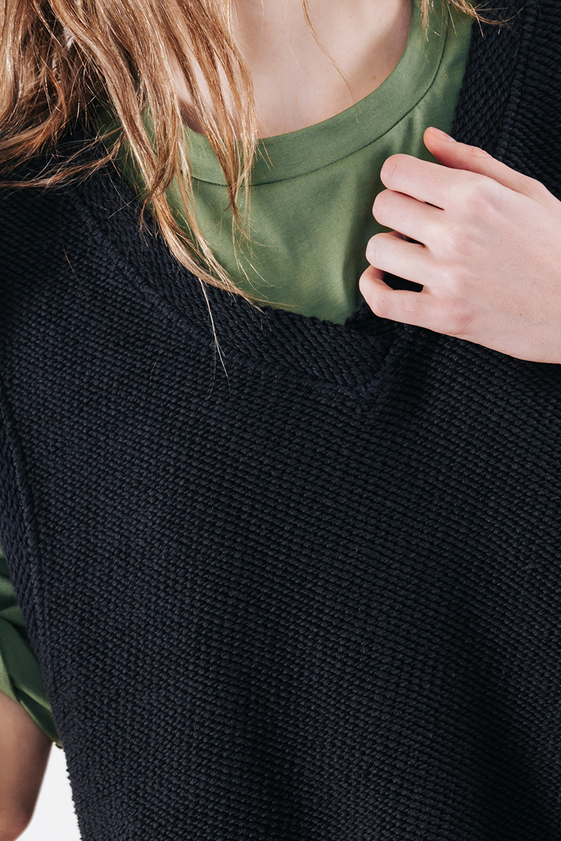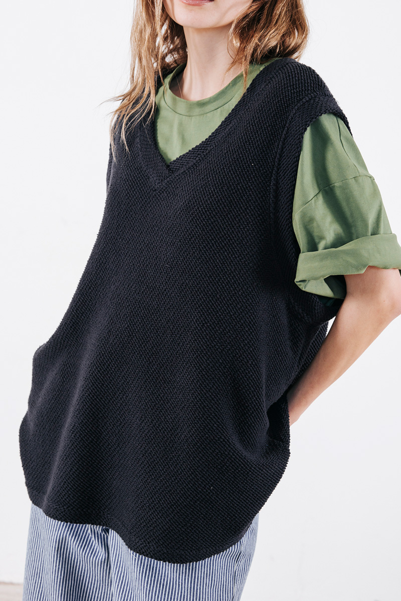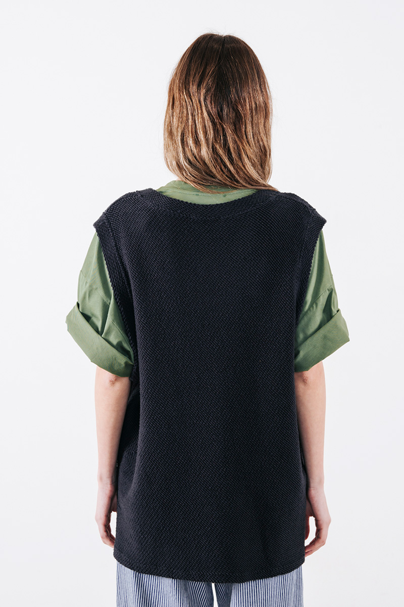 Αμάνικο φαρδύ γιλέκο πλεκτό, με V λαιμόκοψη.