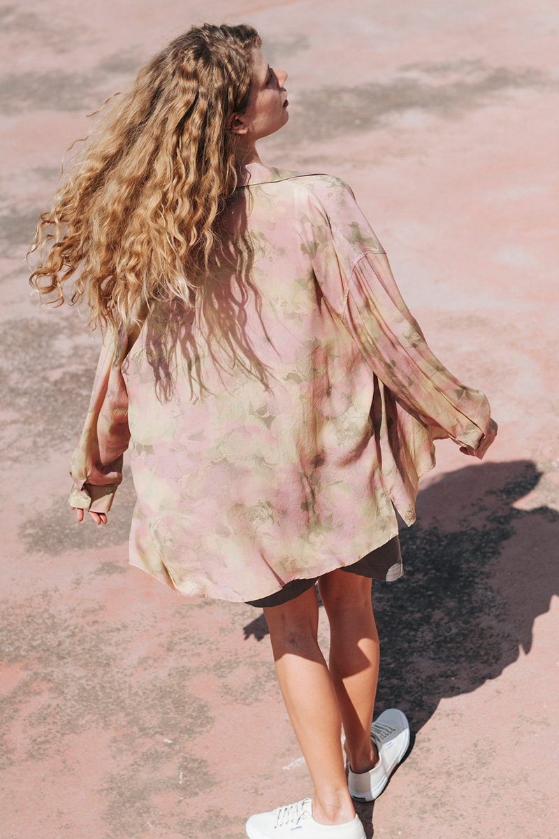 Εμπριμέ φαρδύ πουκάμισο με γιακά, κλείσιμο μπροστά με κουμπιά.