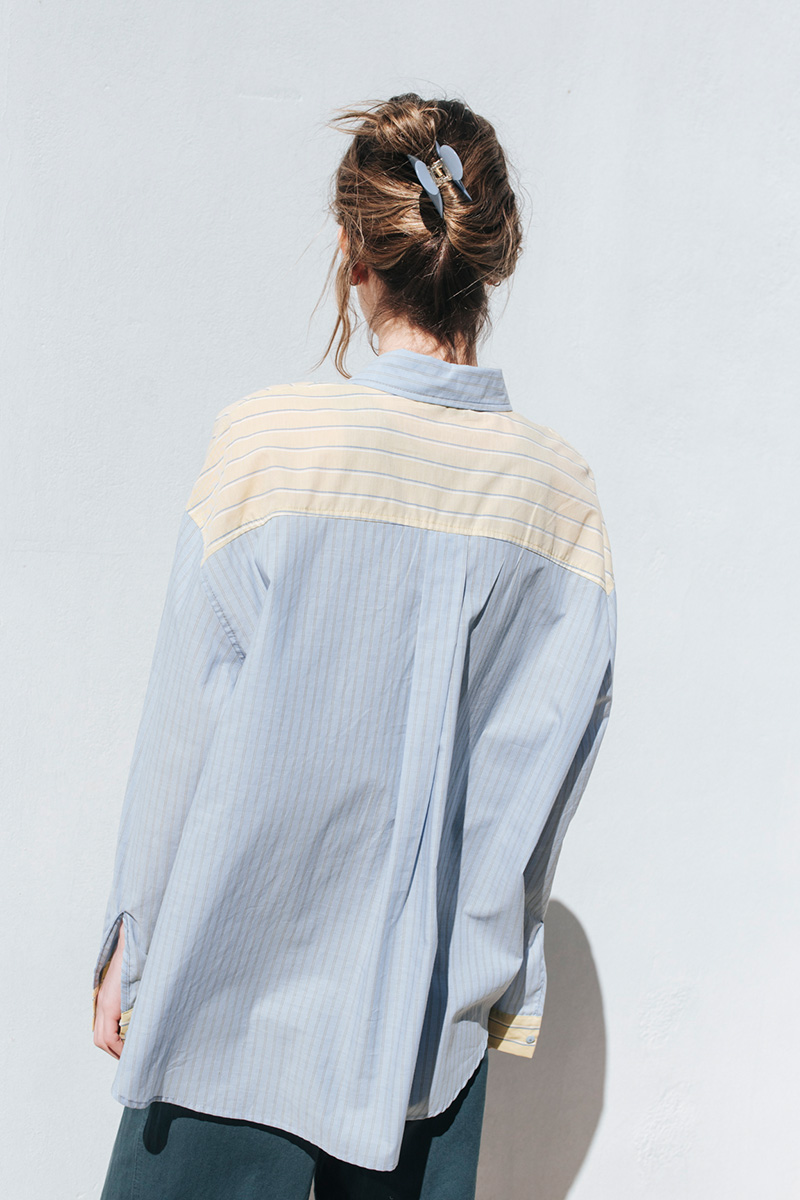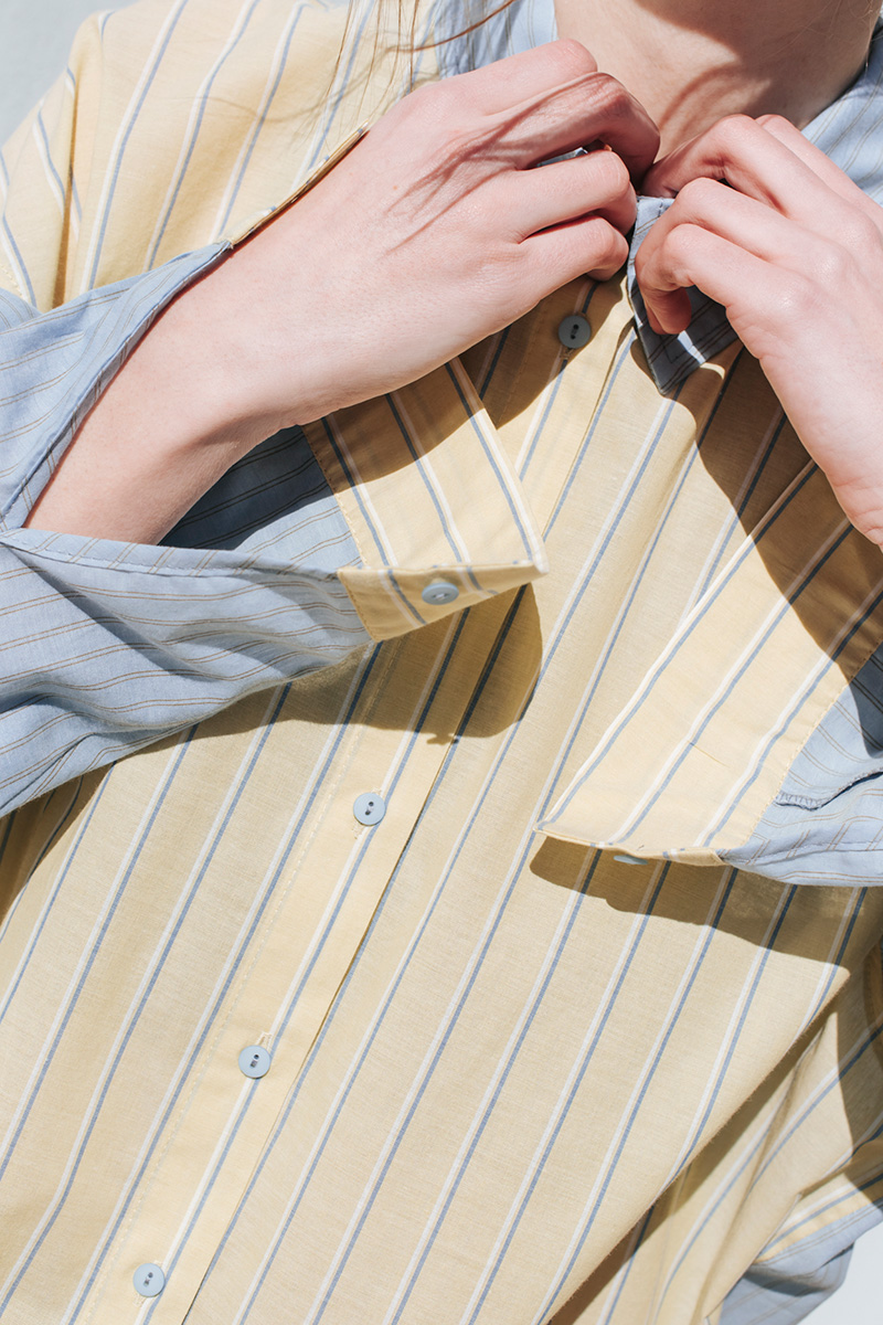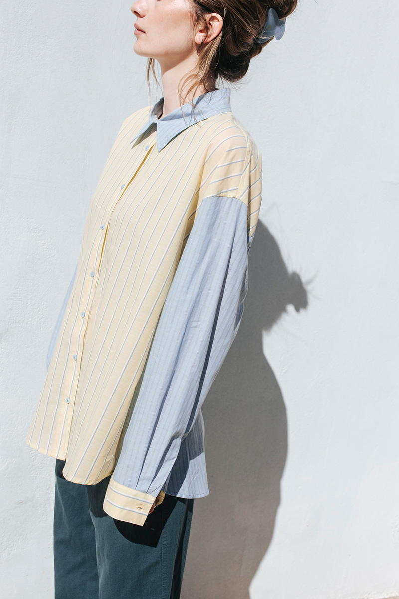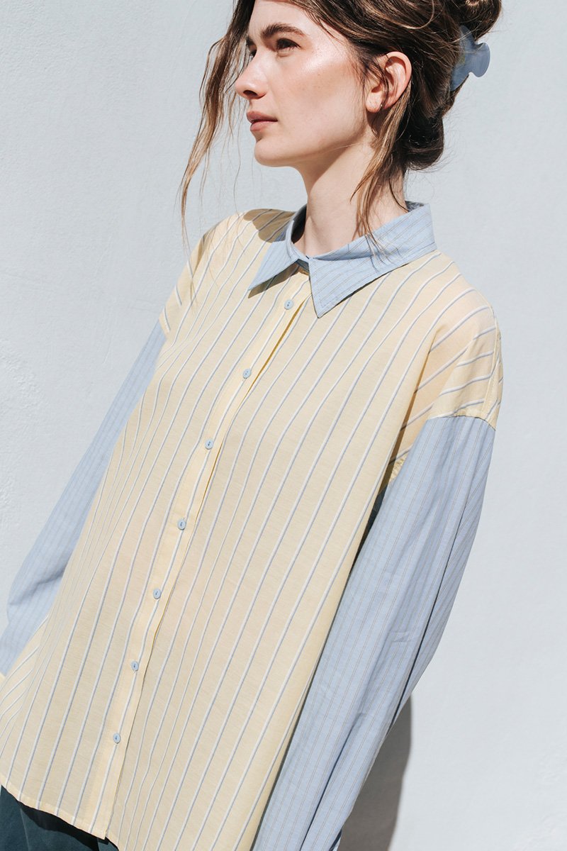 Φαρδύ πουκάμισο δίχρωμο ριγέ με γιακά, κλείσιμο μπροστά με κουμπιά και ασύμμετρο τελείωμα.