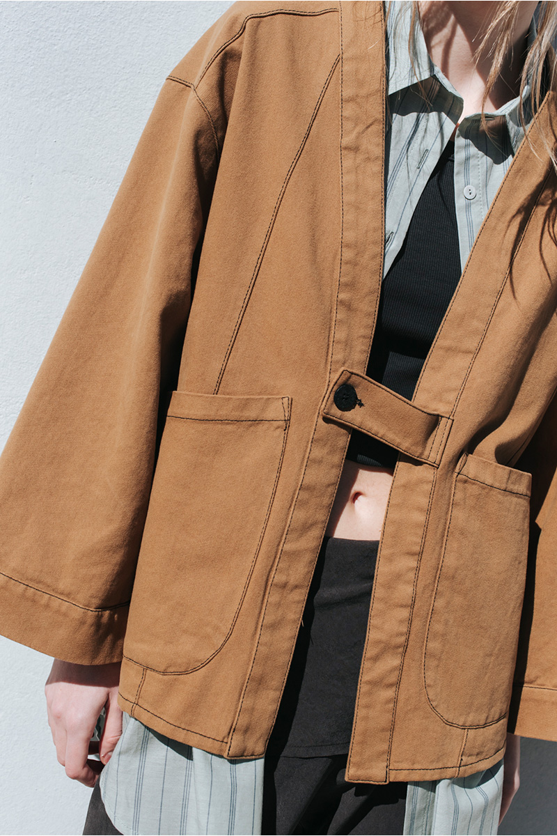 Φαρδύ τζάκετ με τσέπες patch μπροστά, με αντίθεση στις ραφές. Κλείσιμο μπροστά με κουμπί.