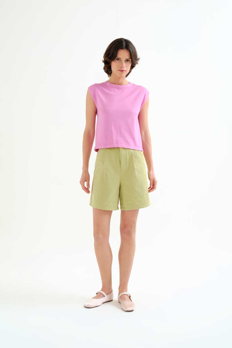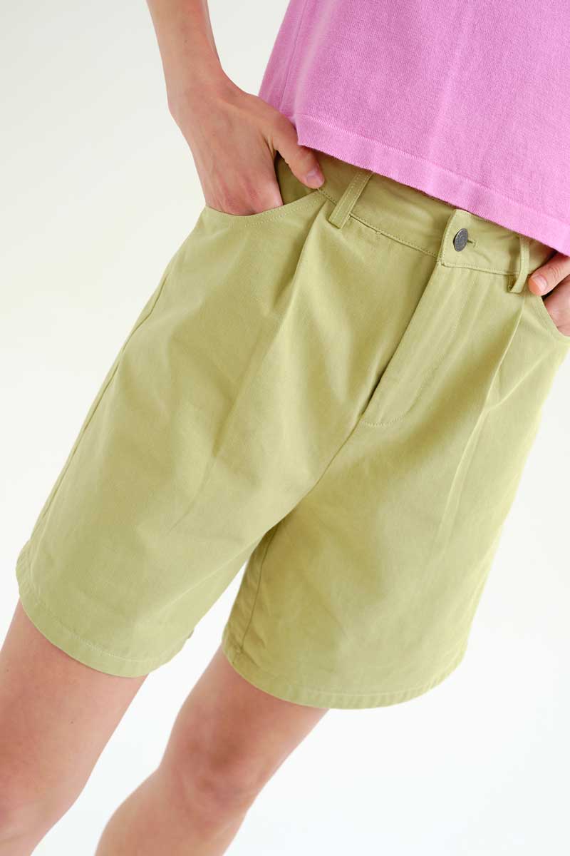 Πράσινο σορτς από 100% βαμβάκι. Ψηλόμεσο με σταθερή ζώνη και ίσιο μπατζάκι.