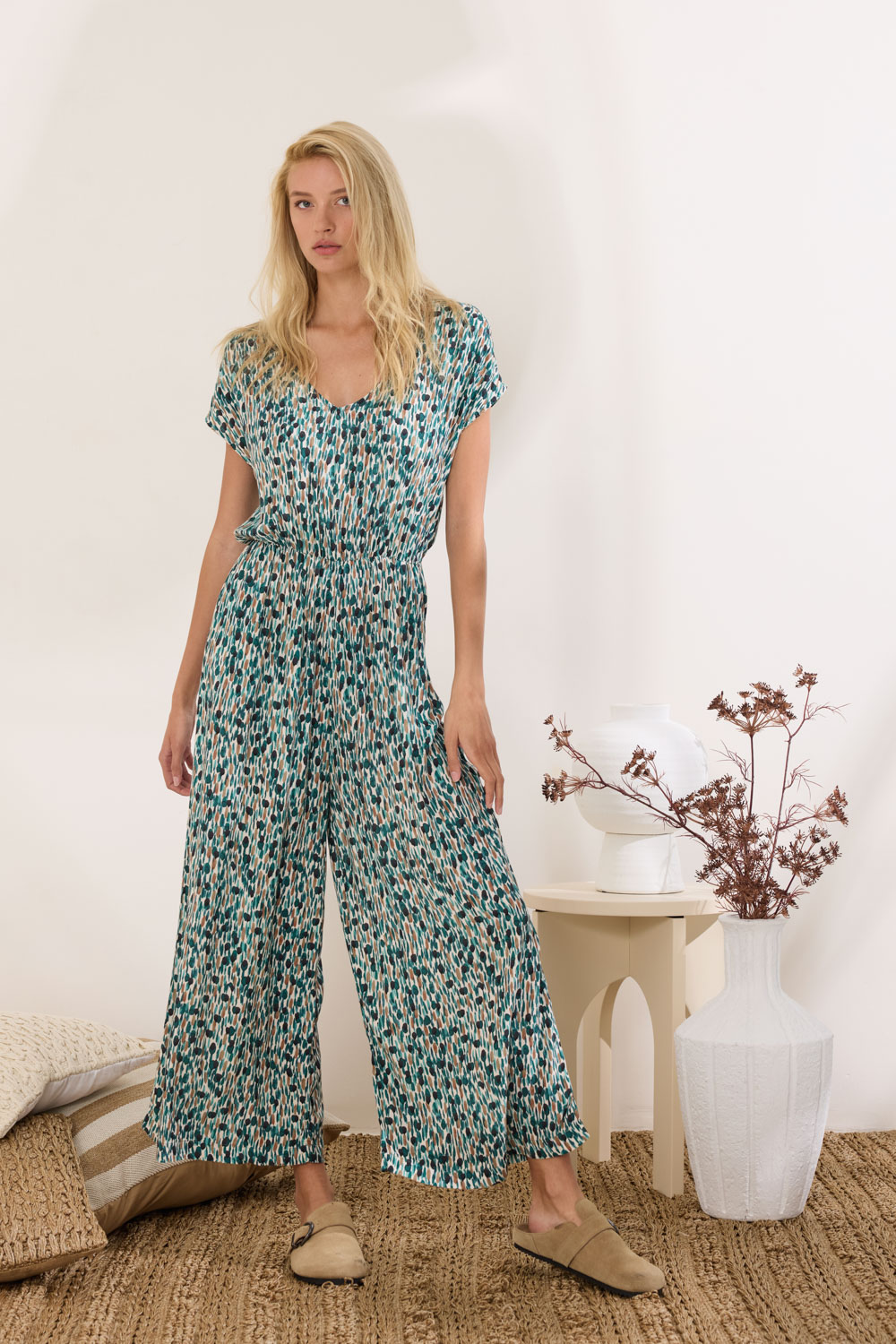 Ολόσωμη φόρμα με λαιμόκοψη V και κοντά μανίκια, σε άνετη γραμμή και μακρύ μήκος.