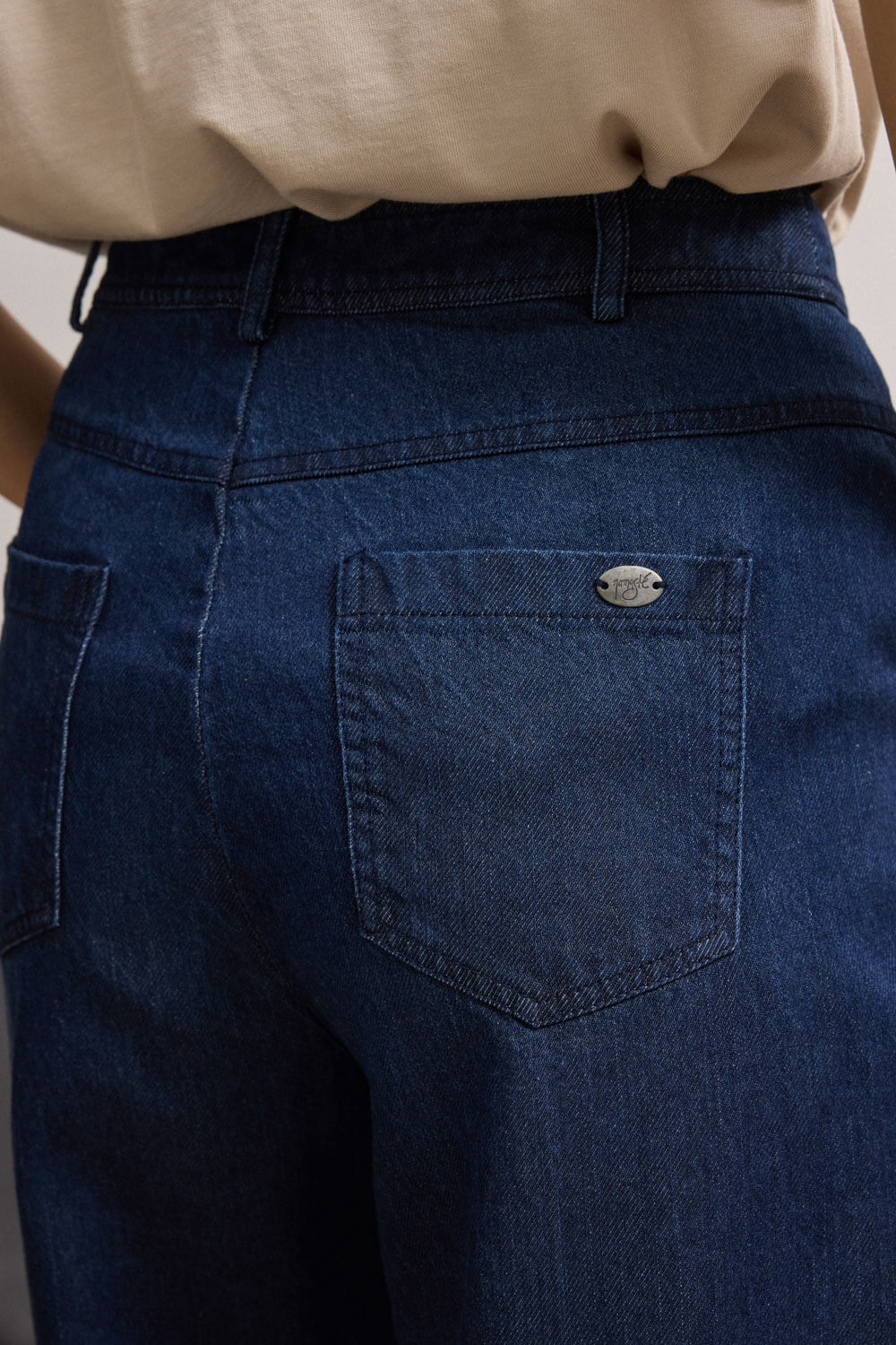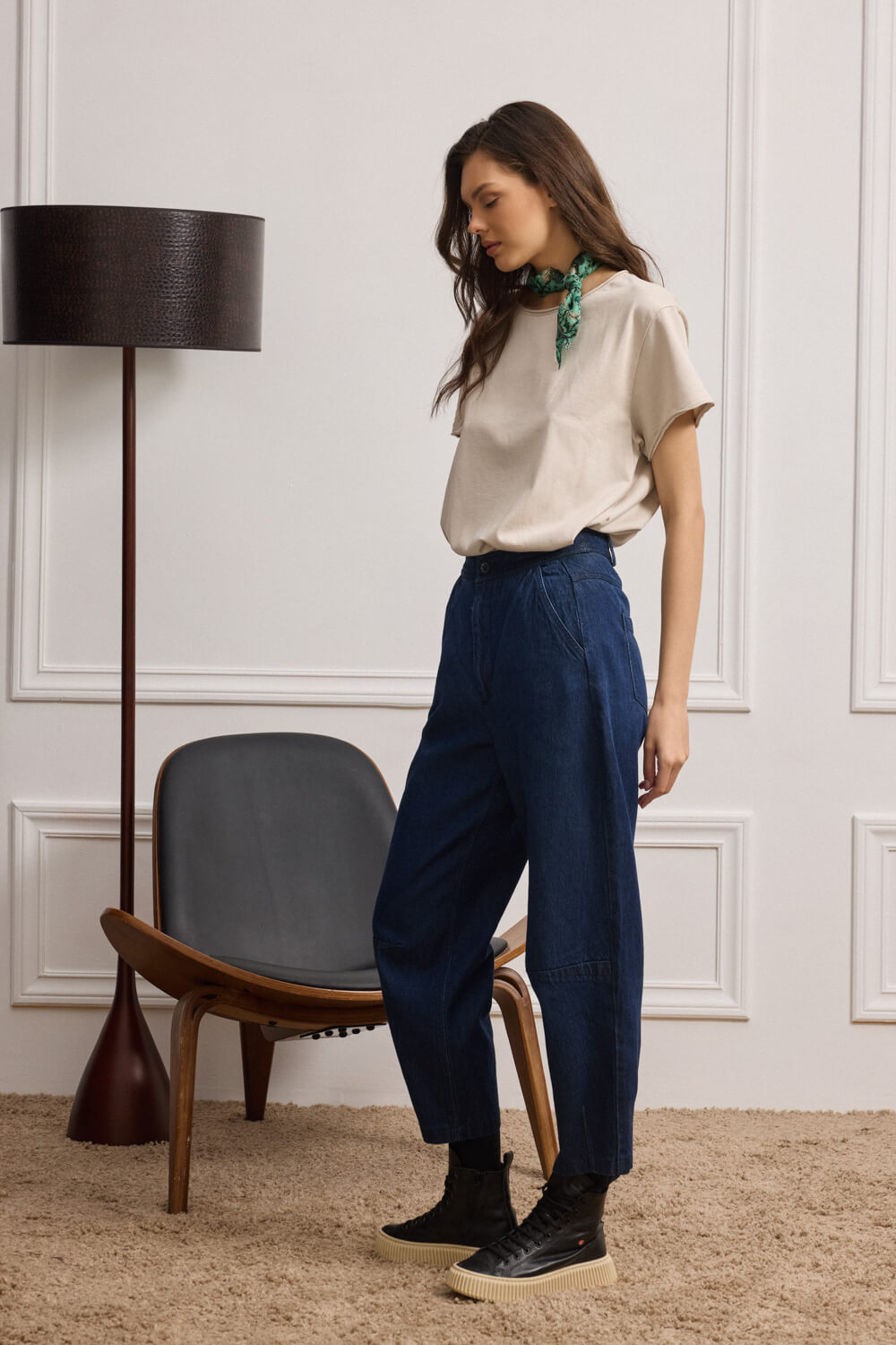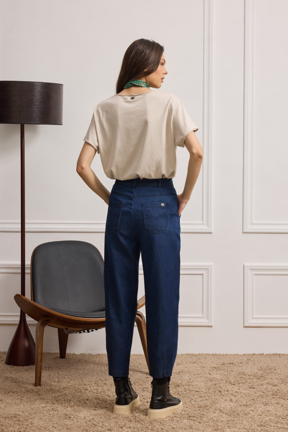 Τζιν παντελόνι σε γραμμή carrot με σχεδιαστικά πενσάκια στο γόνατο και στο στρίφωμα για μοντέρνο όγκο.