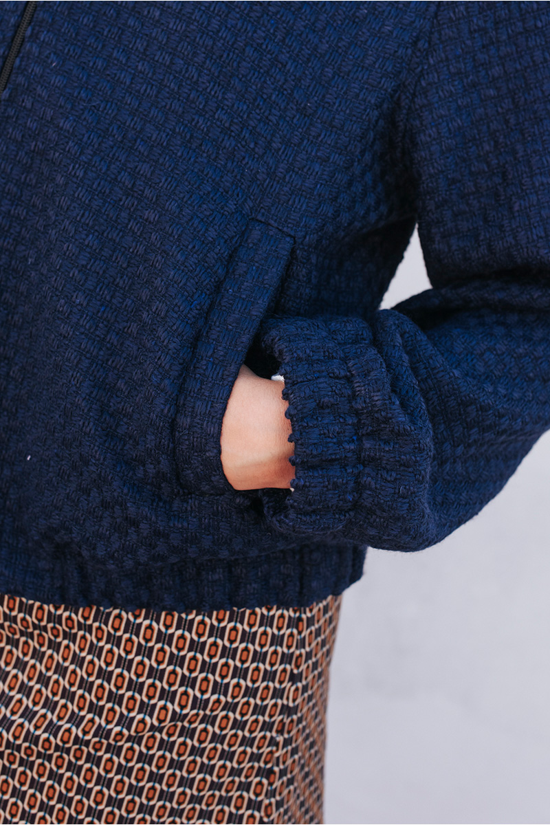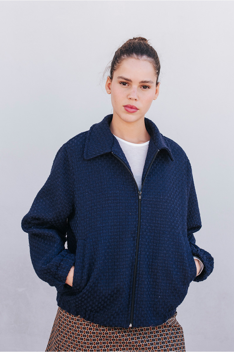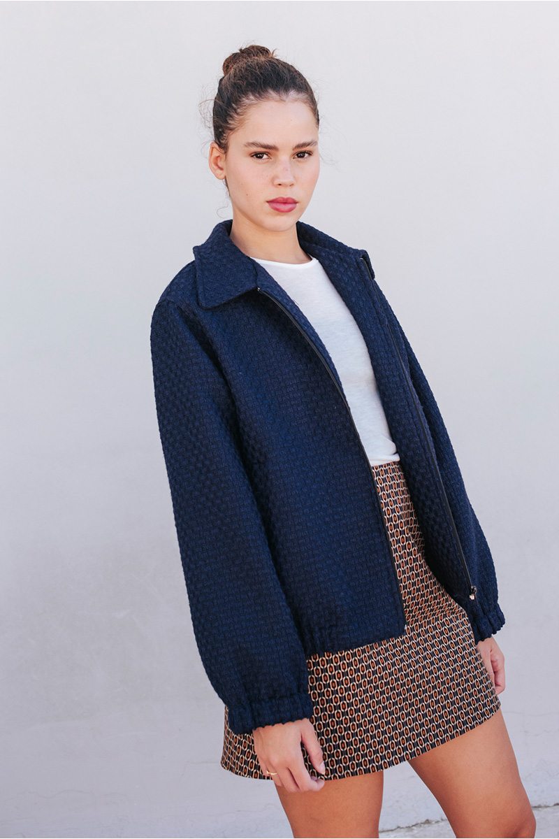 Bomber τζάκετ με γιακά, λάστιχο στο τελείωμα και στα μανίκια, κλείσιμο μπροστά με φερμουάρ και τσέπες στο πλάι.