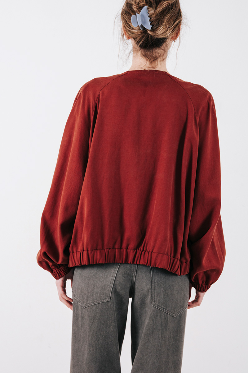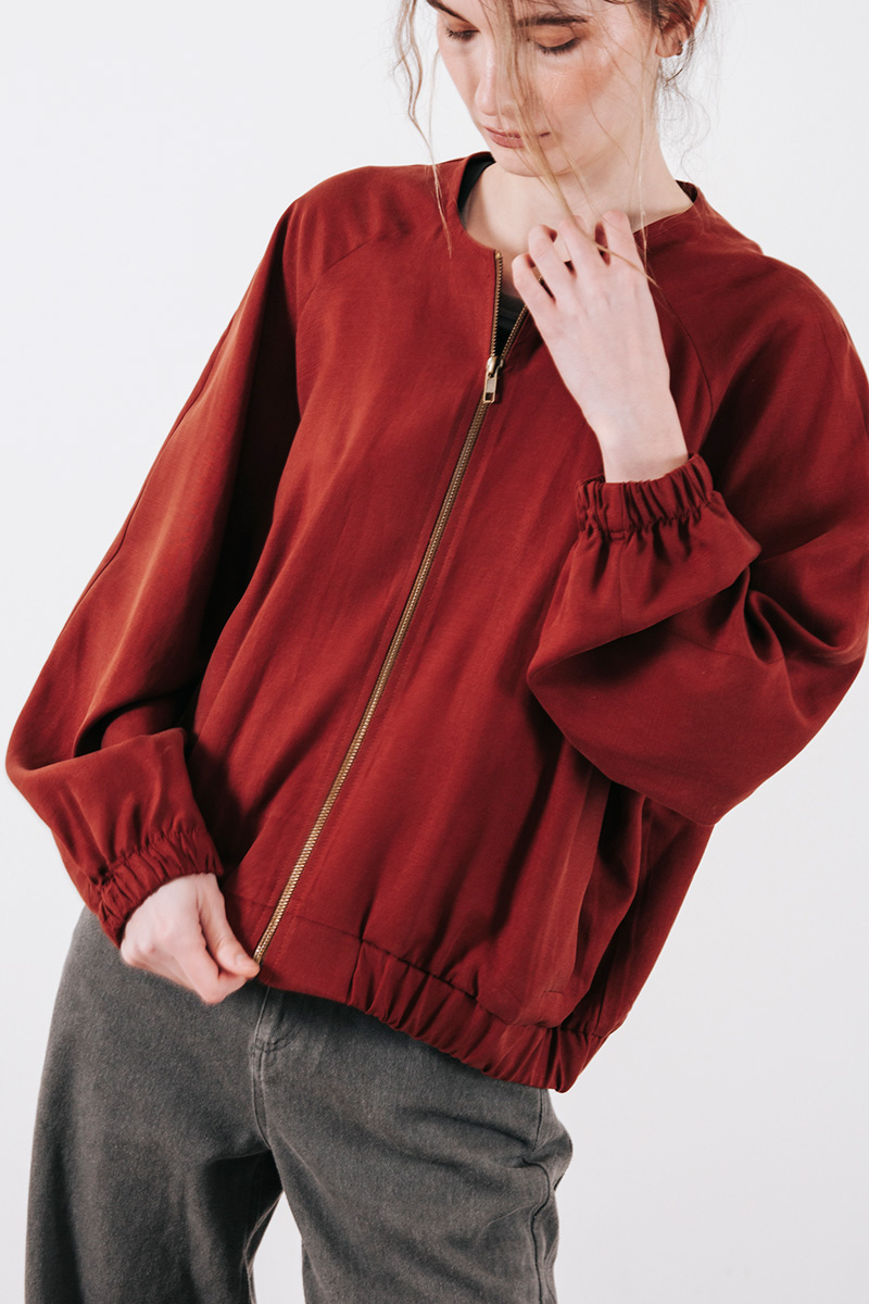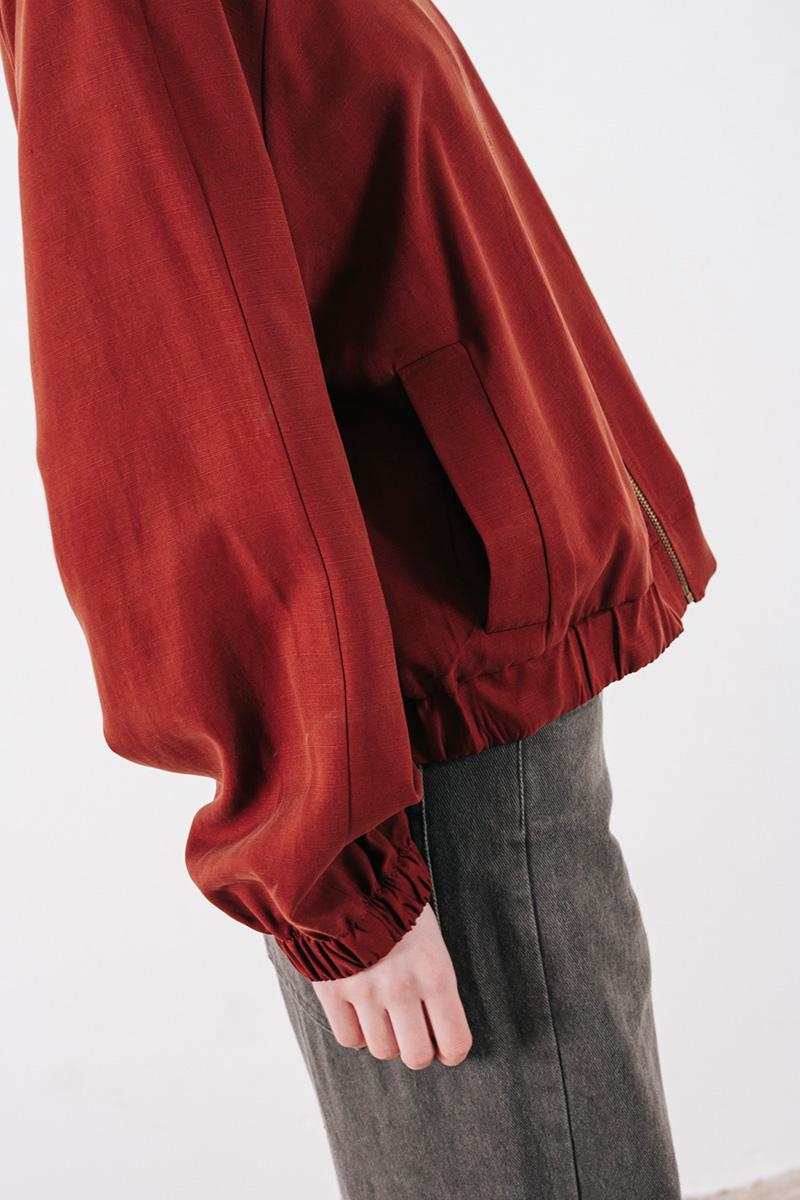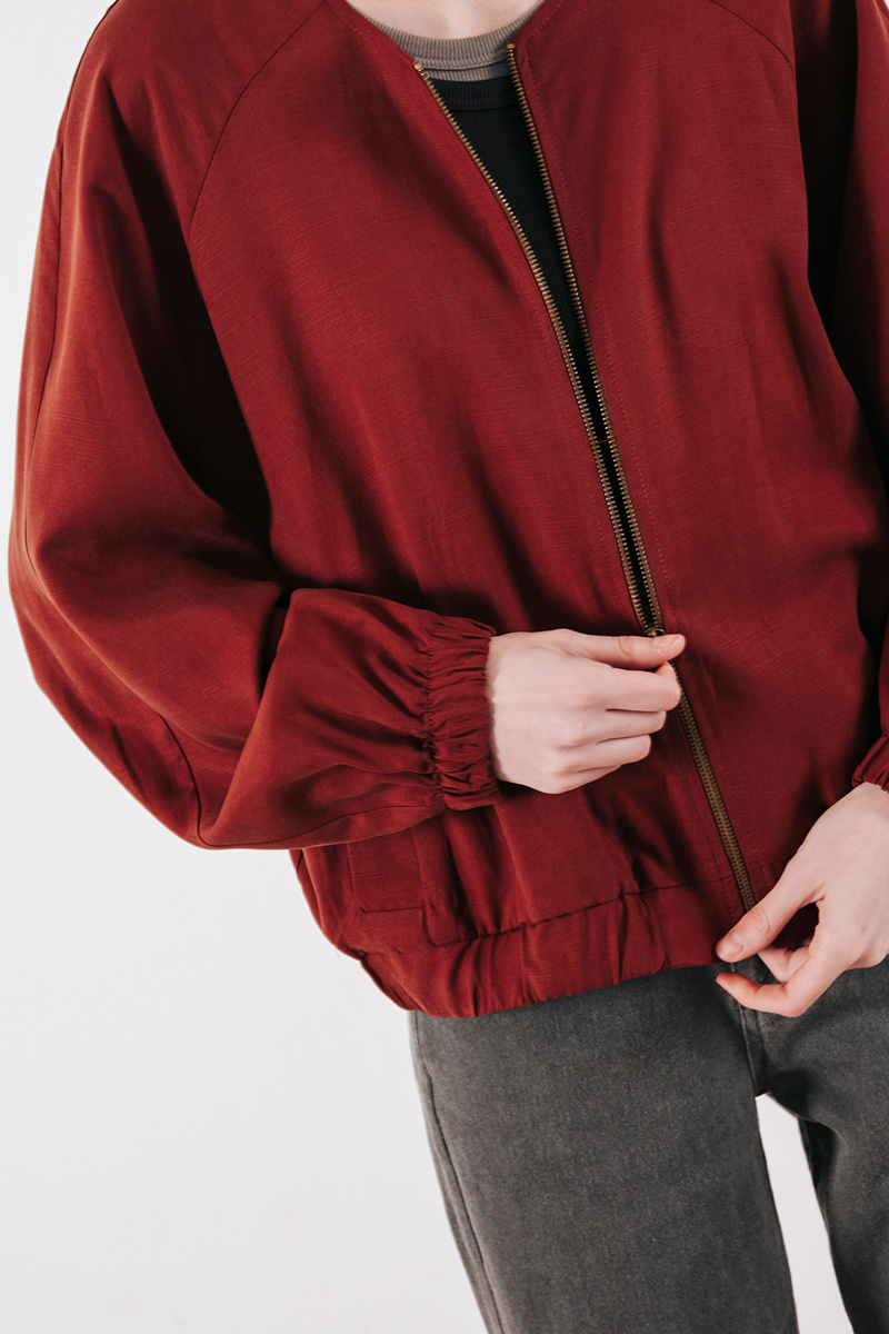 Bomber τζάκετ με λάστιχο στα μανίκια και στο τελείωμα, κλείσιμο μπροστά με φερμουάρ και τσέπες στο πλάι.