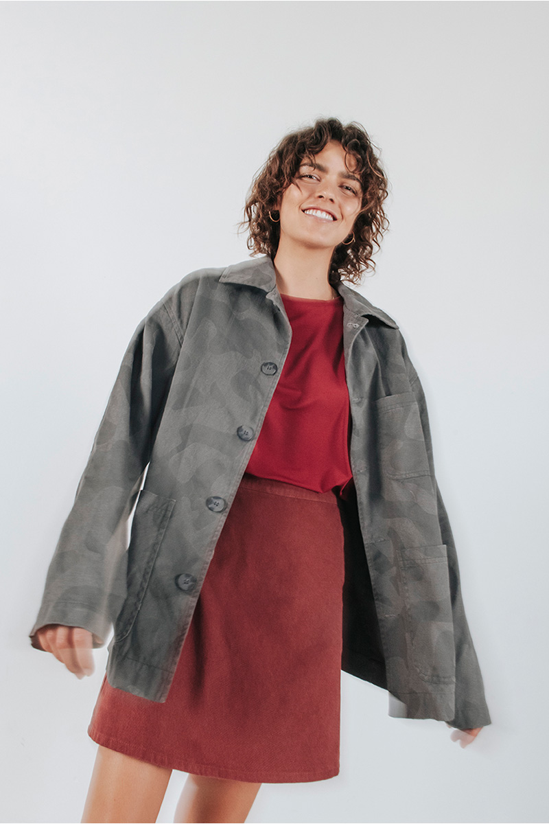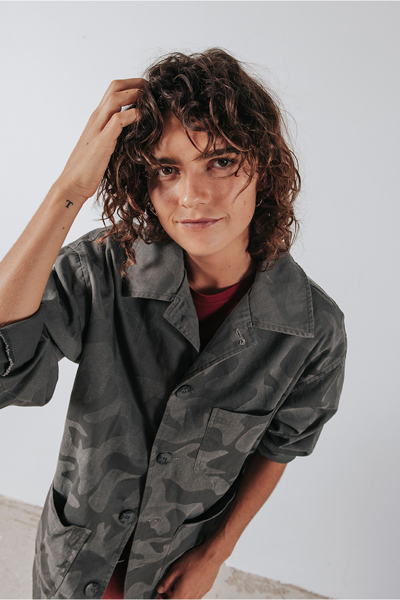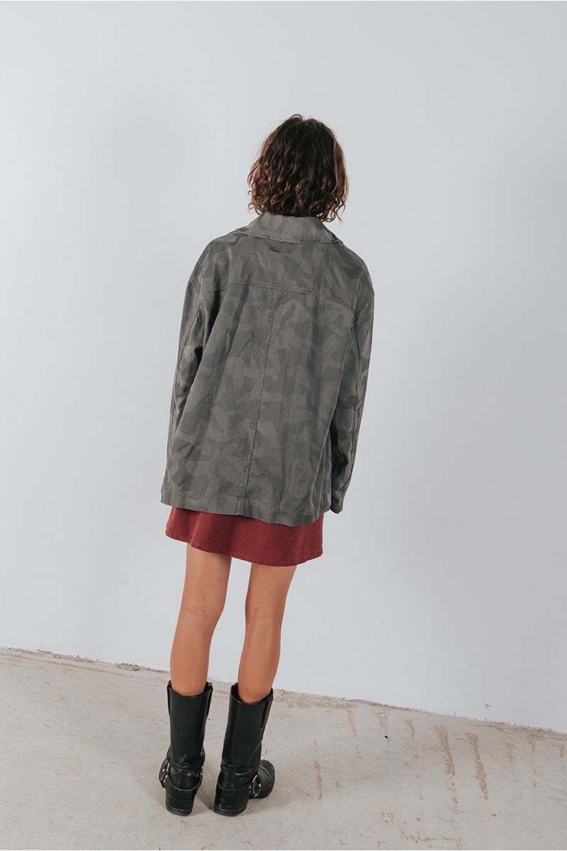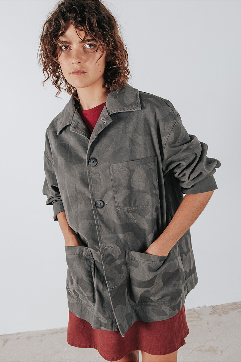 Camo τζάκετ με γιακά, τσέπες μπροστά και κλείσιμο μπροστά με κουμπιά.