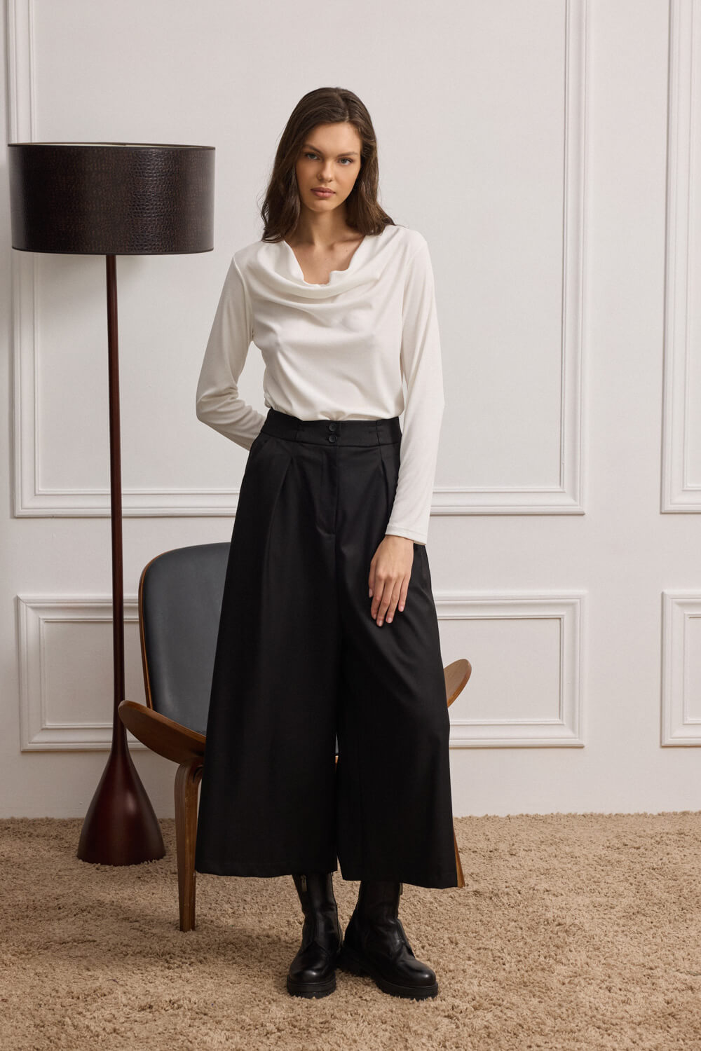 Ψηλόμεσο παντελόνι jupe culotte, σε φαρδιά γραμμή, συνδυάζει την άνεση με τον εκλεπτυσμένο σχεδιασμό.