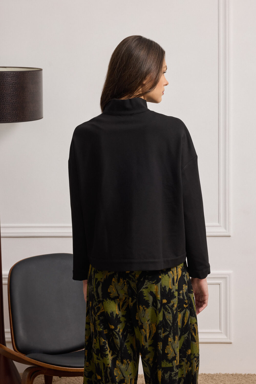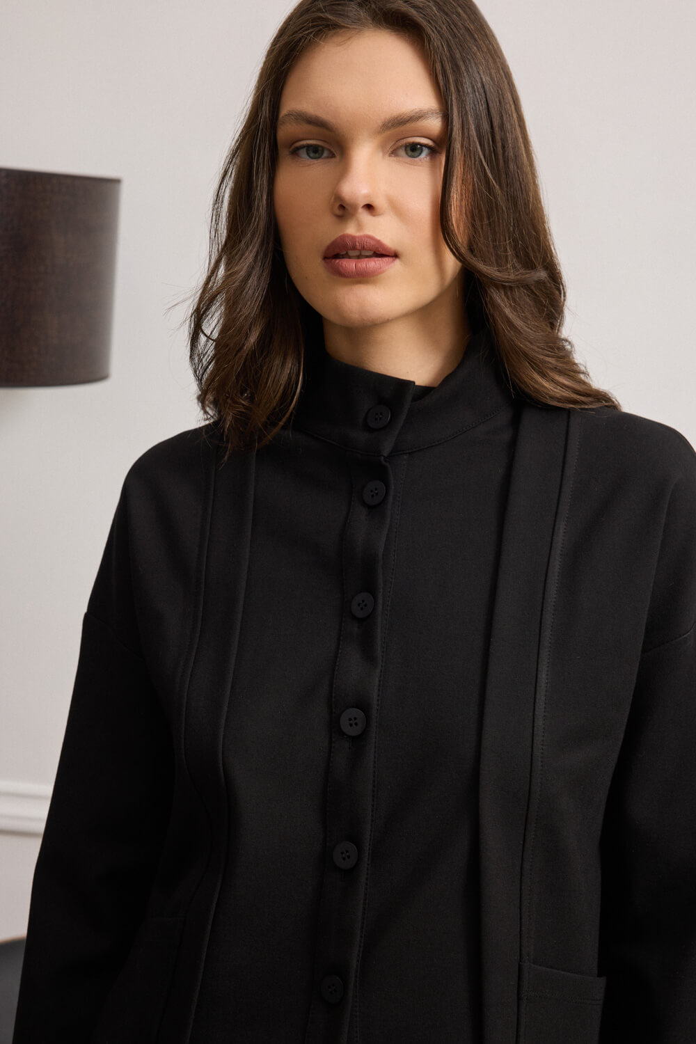 Ο όρθιος γιακάς προσθέτει σύγχρονο χαρακτήρα, ενώ η φάσα μπροστά δημιουργεί ασύμμετρα επίπεδα