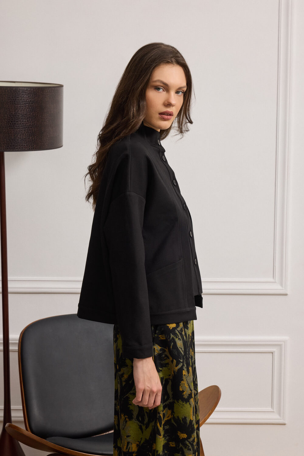 Κομψή κοντή ζακέτα με μακρύ μανίκι, κλείσιμο μπροστά με κουμπιά, λειτουργικές τσέπες εμπρός και ιδιαίτερο σχεδιασμό που την ξεχωρίζει.