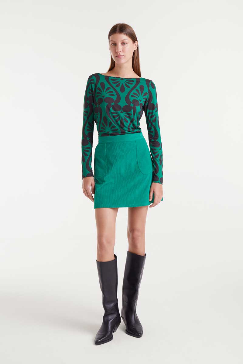 Πράσινο μπλουζάκι με μπαρόκ τύπωμα. Με ανοιχτή λαιμόκοψη και μακριά μανίκια.